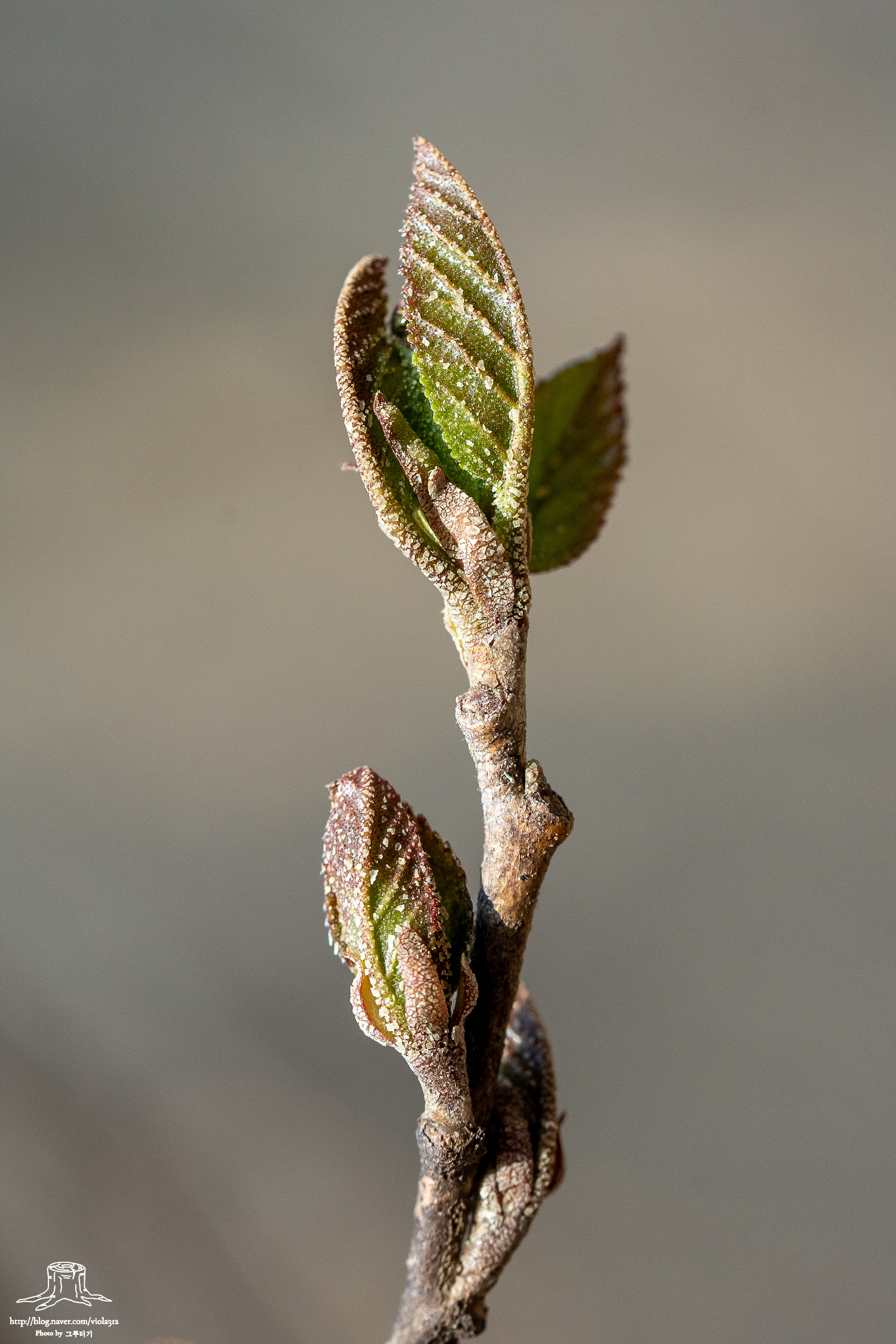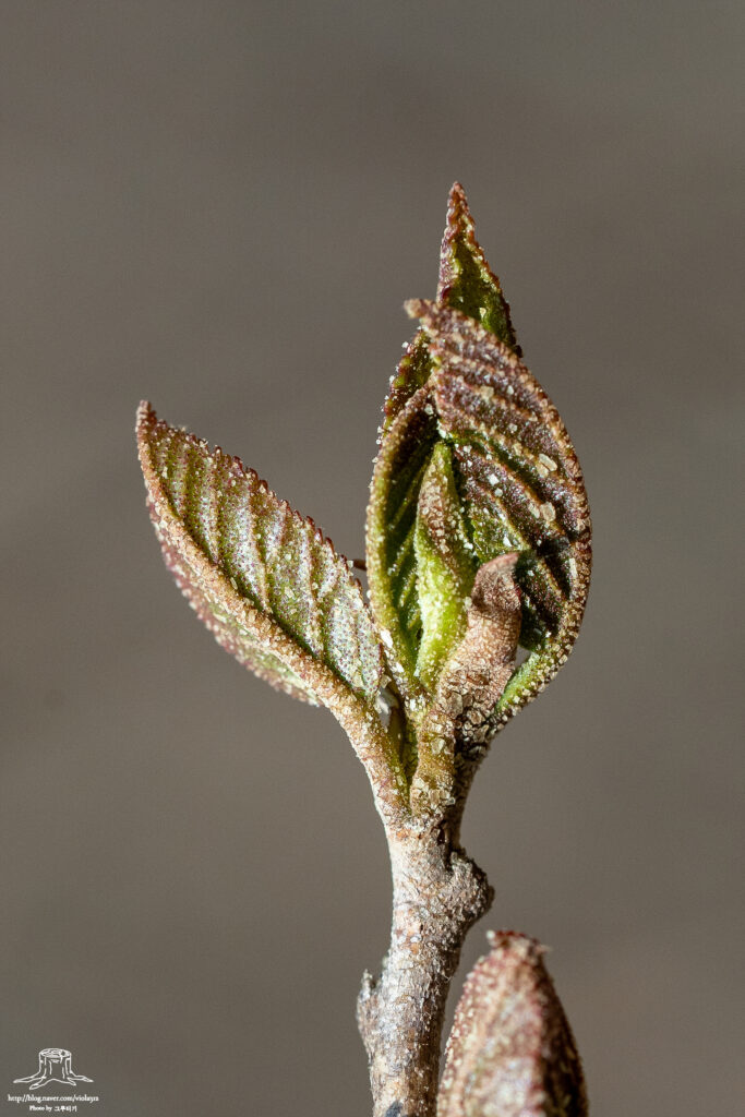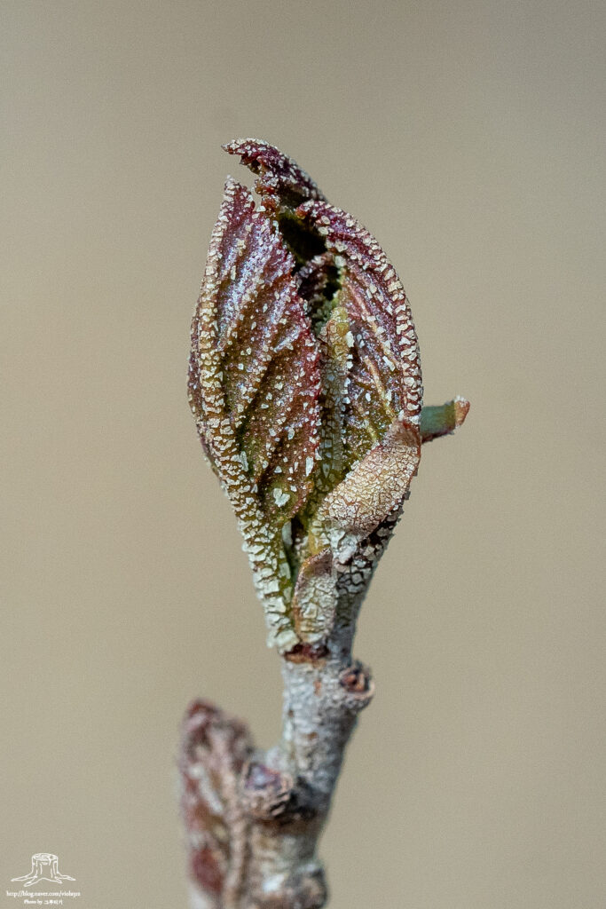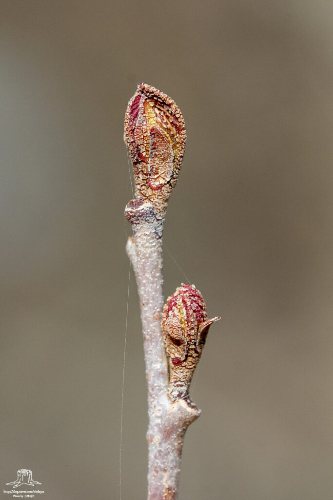 밀랍 성분에 쌓인 겨울눈이 그대로 성장하면서 바깥쪽에 잎과 탁엽이 서로 붙어 있는 것이다. 겨울에는 밀랍 성분 때문에 뚜렷하게 보이지 않지만 조금만 성장하면 잎과 탁엽이 그대로 노출되어 있는 양상을 볼 수 있다.