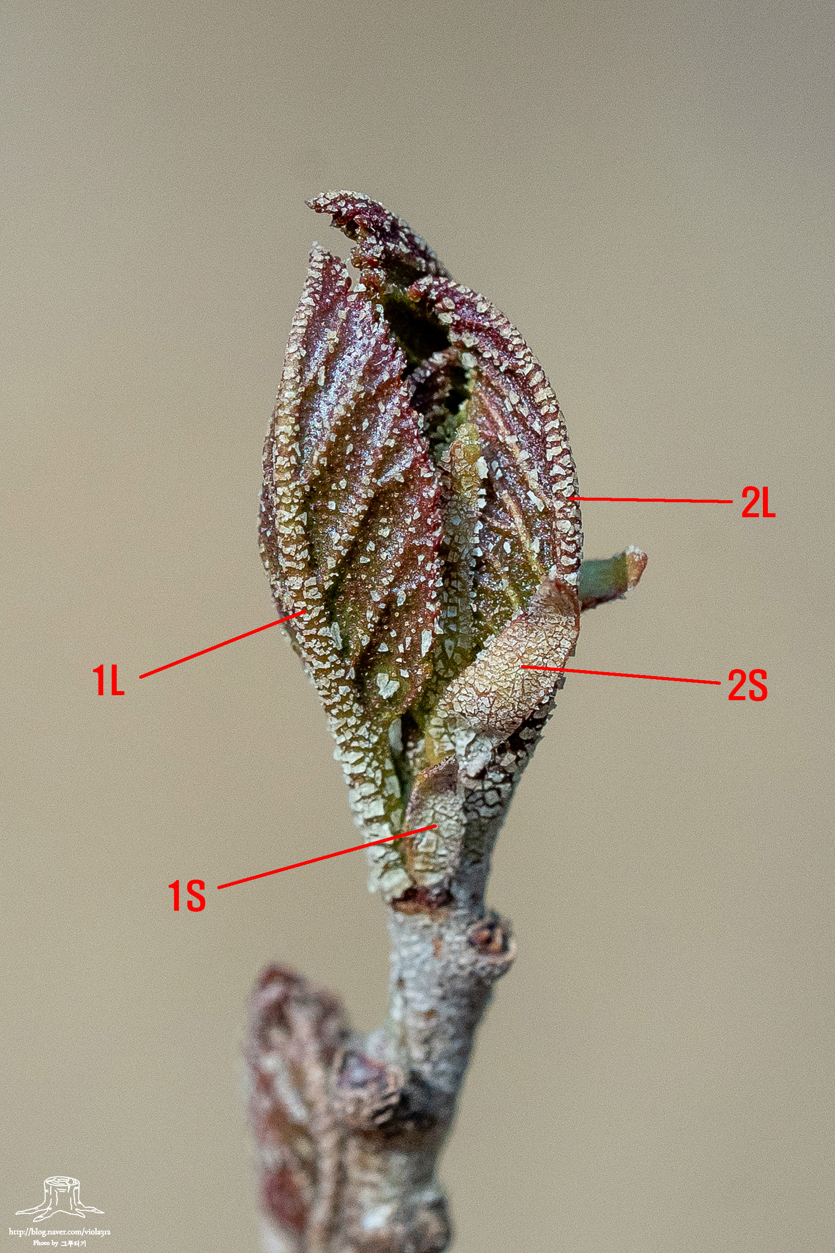 오리나무 영양눈이 더 성장한 모습을 보면 확실하게 알 수 있다. 아래 사진에서 첫 번째 잎(1L)과 첫 번째 탁엽(1S)이 보이고, 두 번째 잎(2L)과 두 번째 탁엽(2S)을 볼 수 있다.