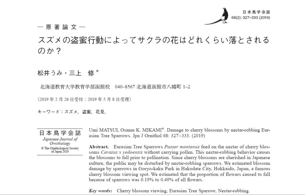 참새는 벚꽃의 꿀을 먹을 때 꽃을 뜯어내듯 훼손하는데, 이러한 행동은 ‘꿀 도둑; nectar robbing’이라 불린다. 실제 연구에 따르면 참새가 떨어뜨리는 꽃은 전체의 0.2~0.5% 수준으로, 눈에 보이는 것보다 생태적 영향은 크지 않은 것으로 나타났다.
