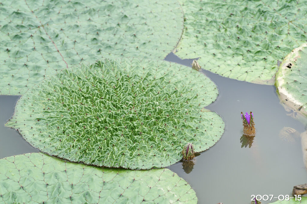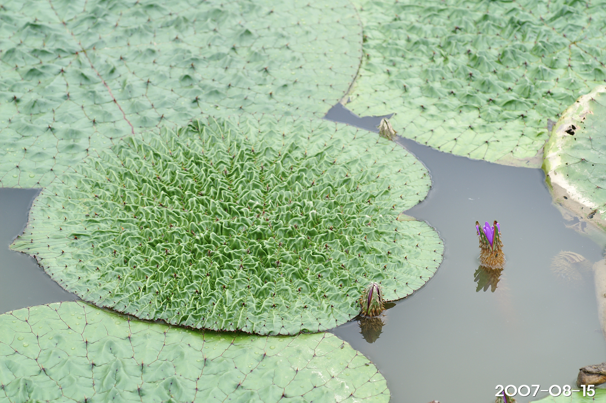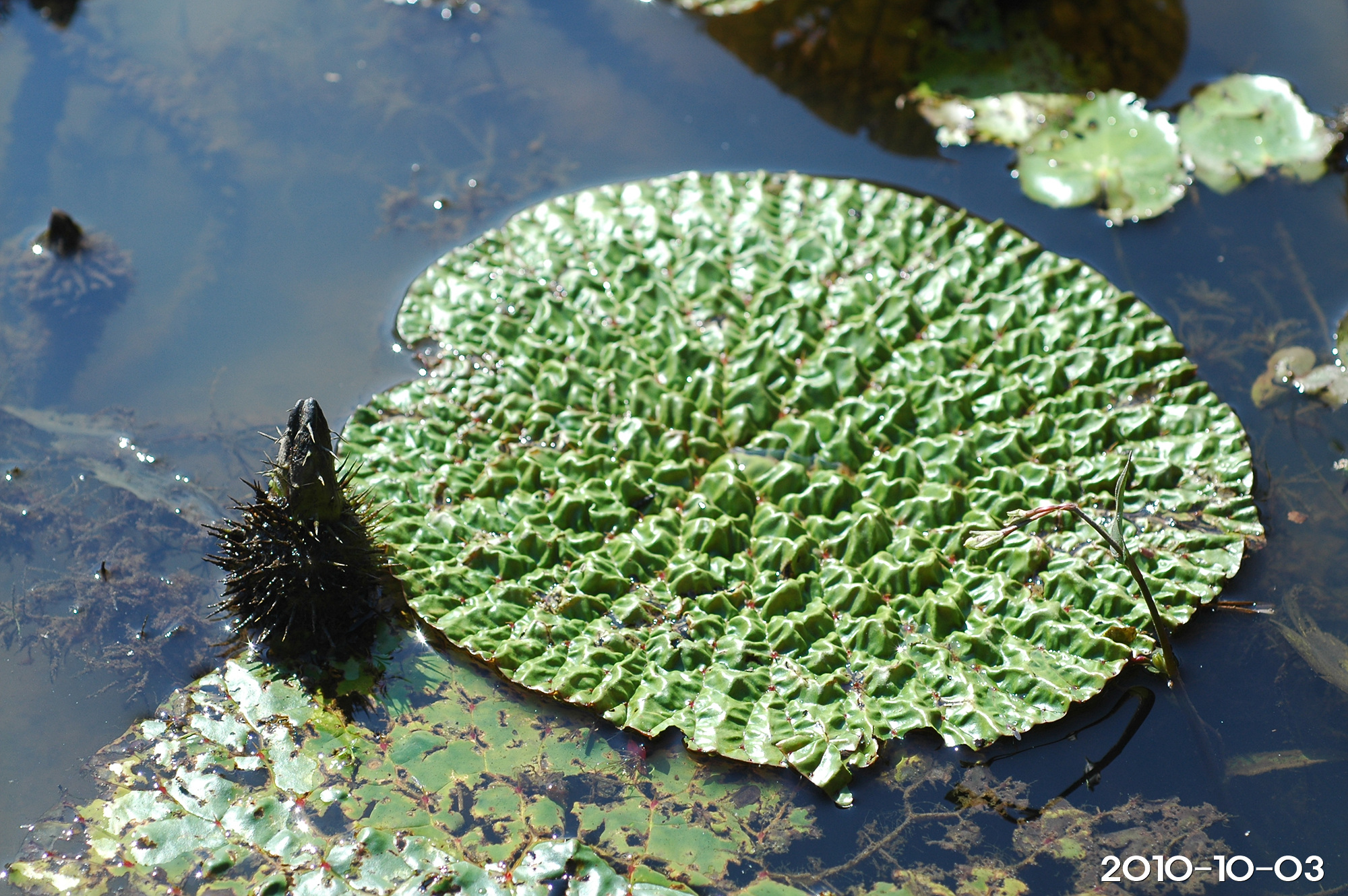 – 잎: 지름 20~120cm, 타원형, 물 위에 뜸. 잎 표면은 광택이 나며 주름져 있고, 뒷면은 흑자색, 잎의 양면 잎맥 위에 가시가 있음
