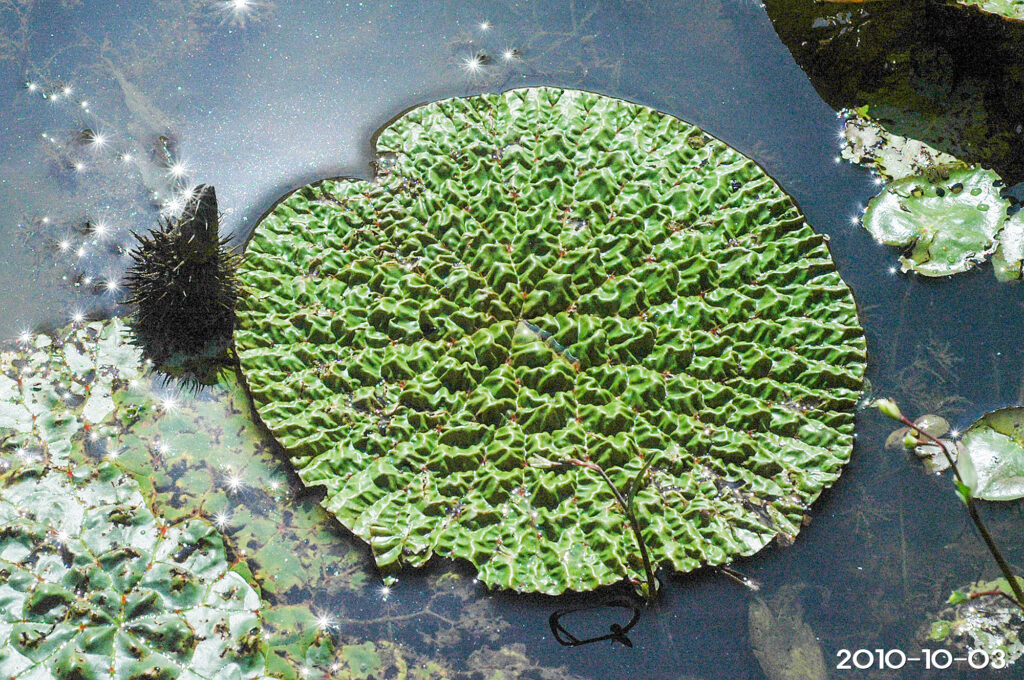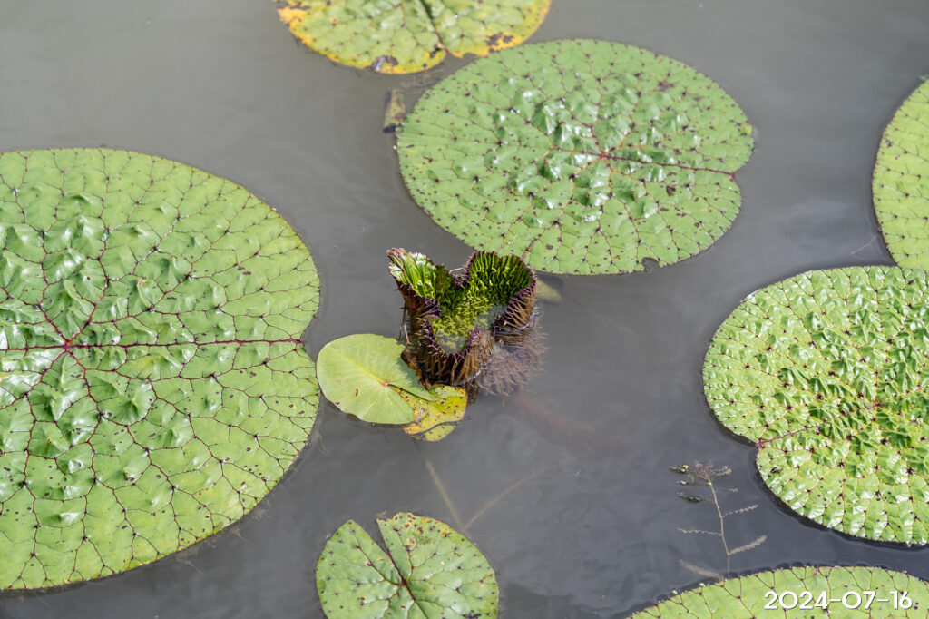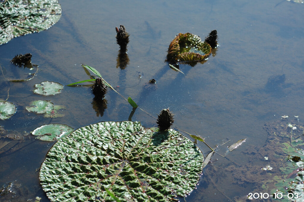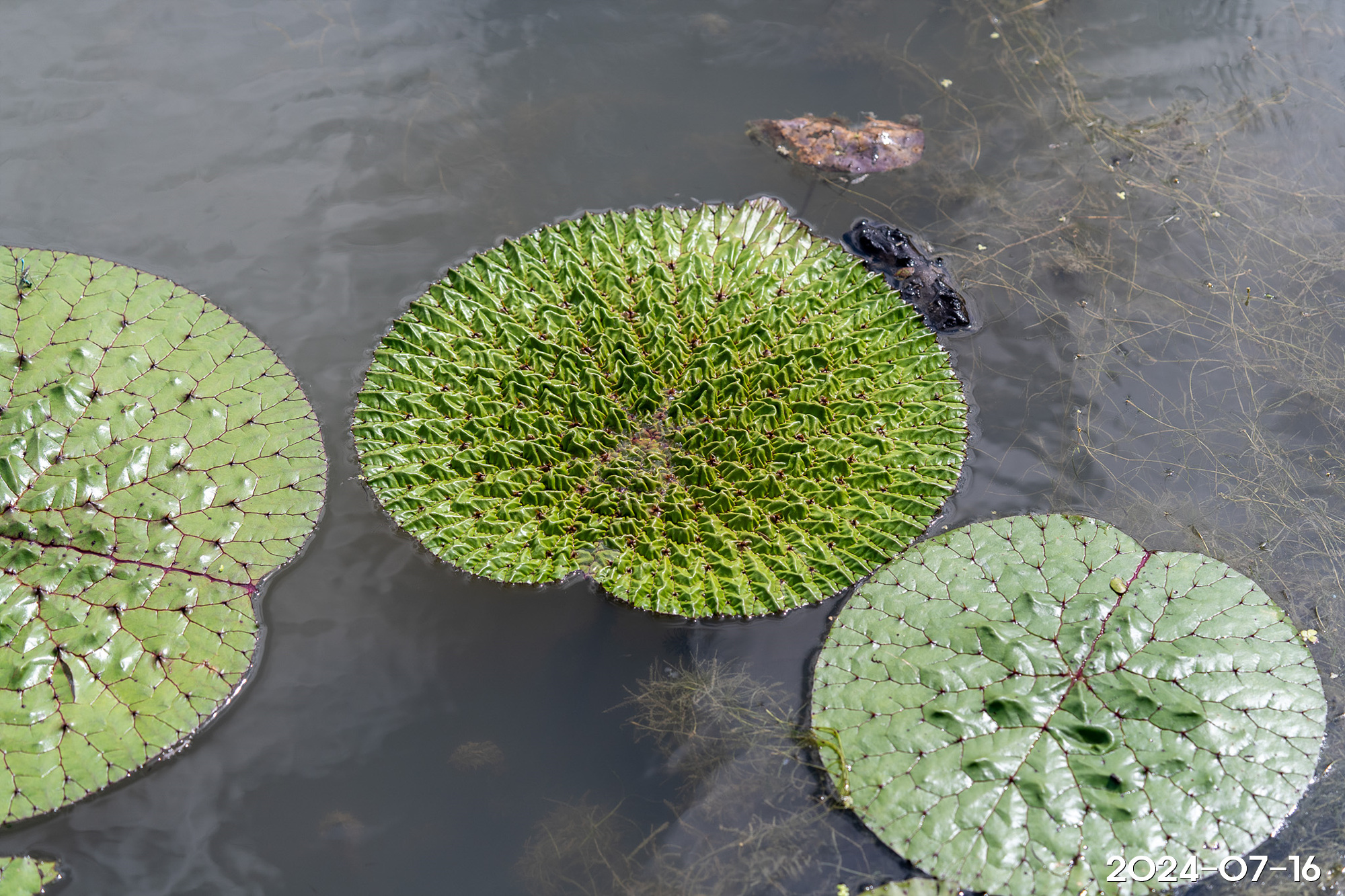 – 잎: 지름 20~120cm, 타원형, 물 위에 뜸. 잎 표면은 광택이 나며 주름져 있고, 뒷면은 흑자색, 잎의 양면 잎맥 위에 가시가 있음
