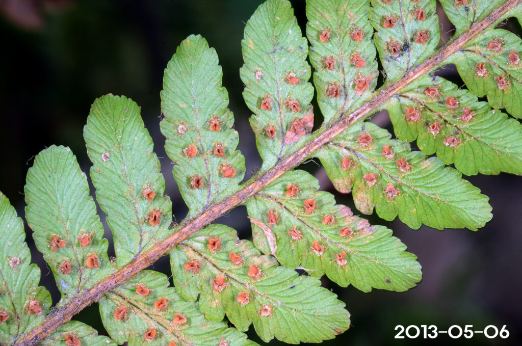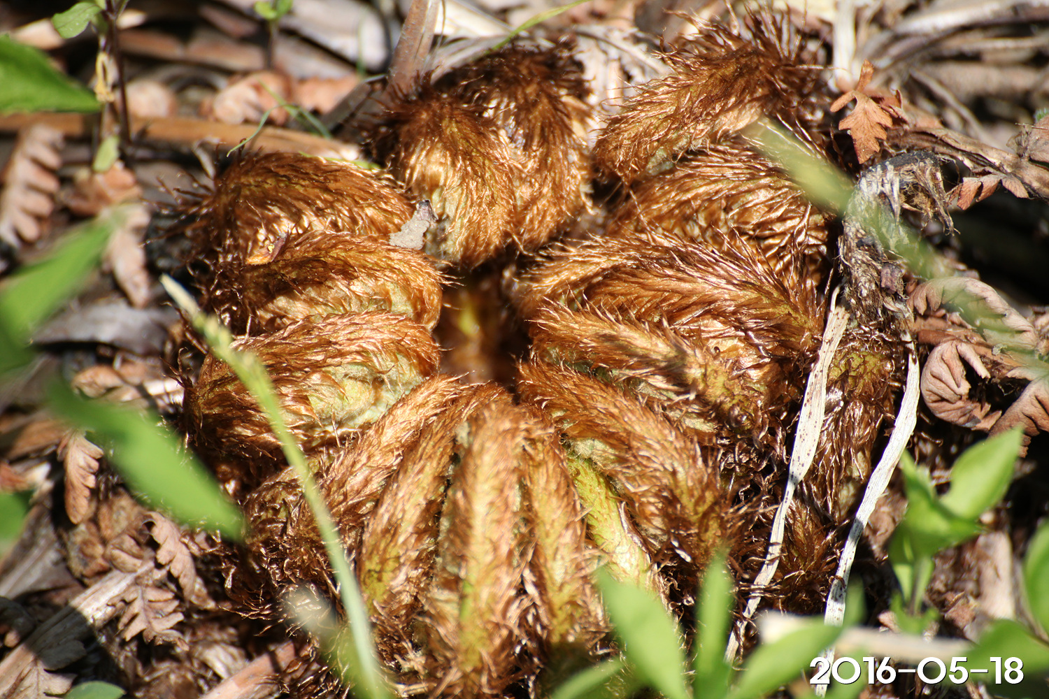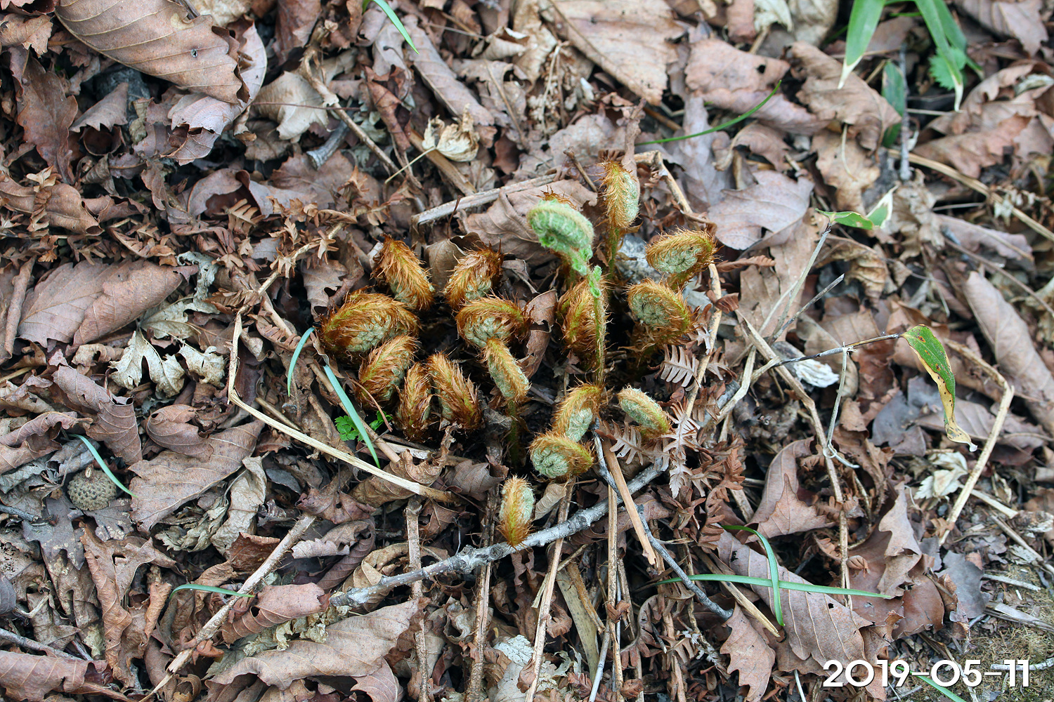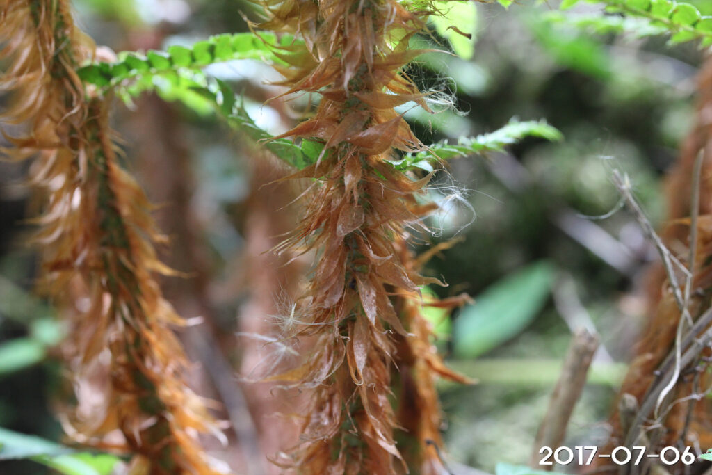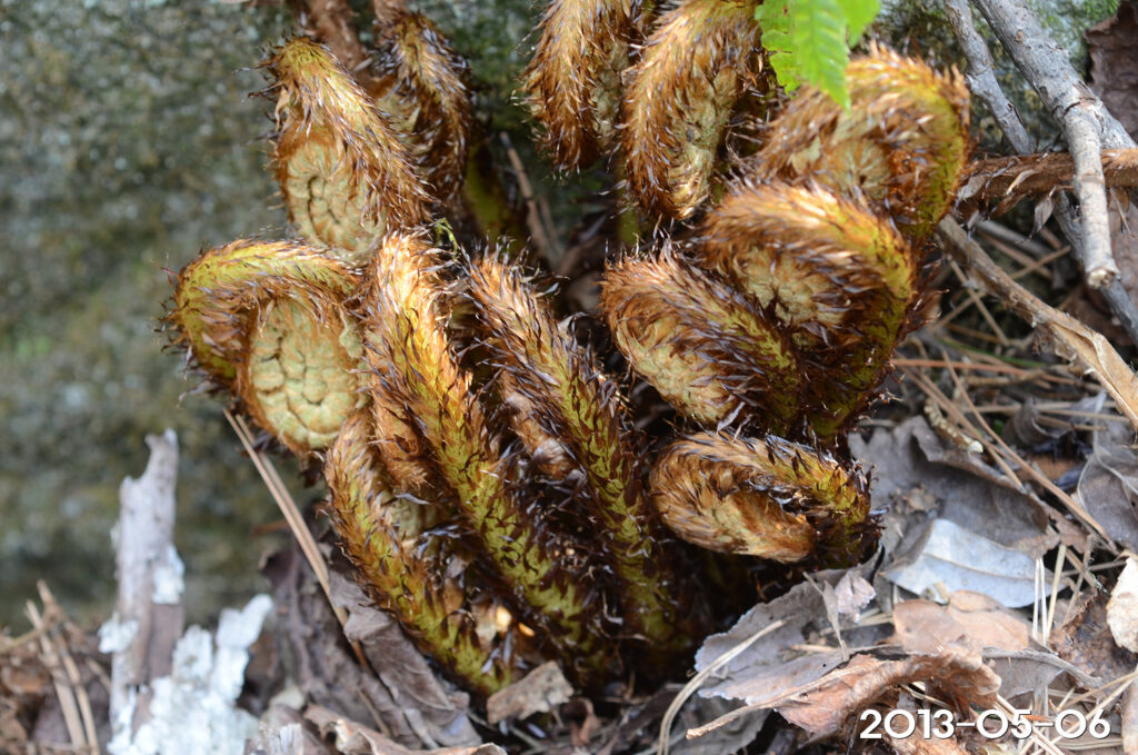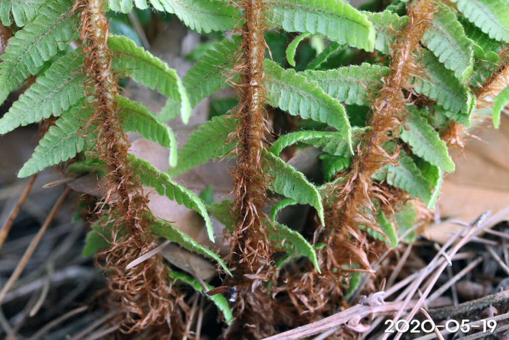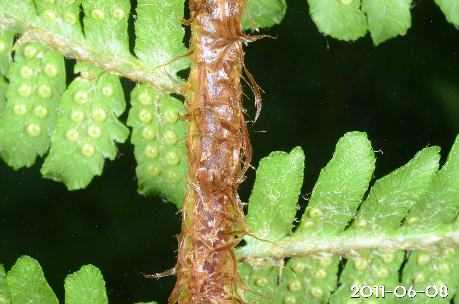 – 비늘조각: 옅은 갈색~짙은 갈색, 난상 피침형~좁은 피침형, 길이 1~3cm, 잎자루 아래쪽에 붙은 비늘조각이 보다 큼