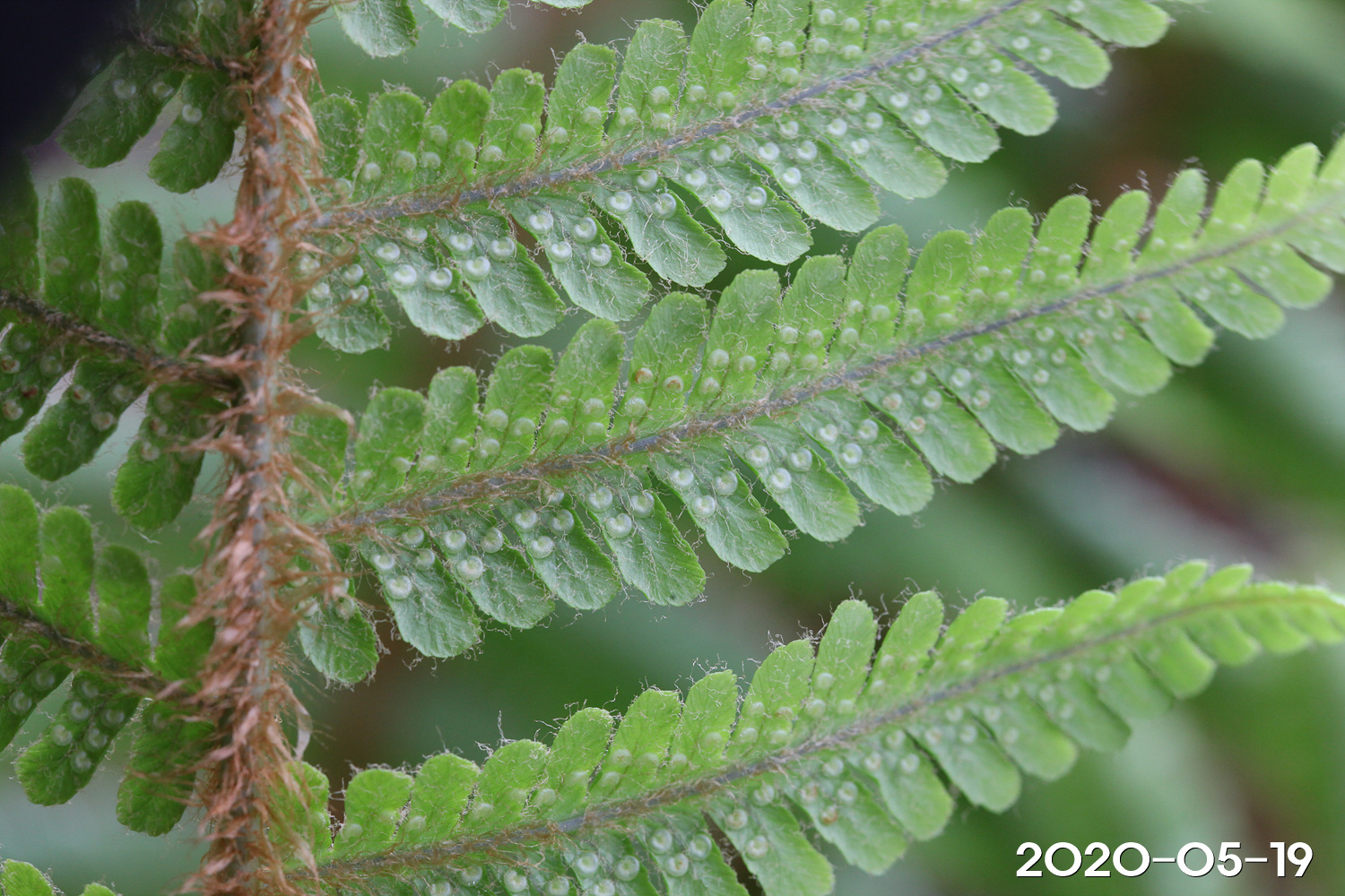 – 잎몸: 타원형 또는 난상 타원형, 길이 50~120cm, 폭 15~30cm, 2회 깃꼴로 깊게 갈라지며, 중심축에 비늘조각이 빽빽함. 우편은 20~30쌍, 난상 피침형, 길이 8~15cm, 폭 1.5~3.0cm, 자루가 없으며, 아래쪽 우편이 보다 작음