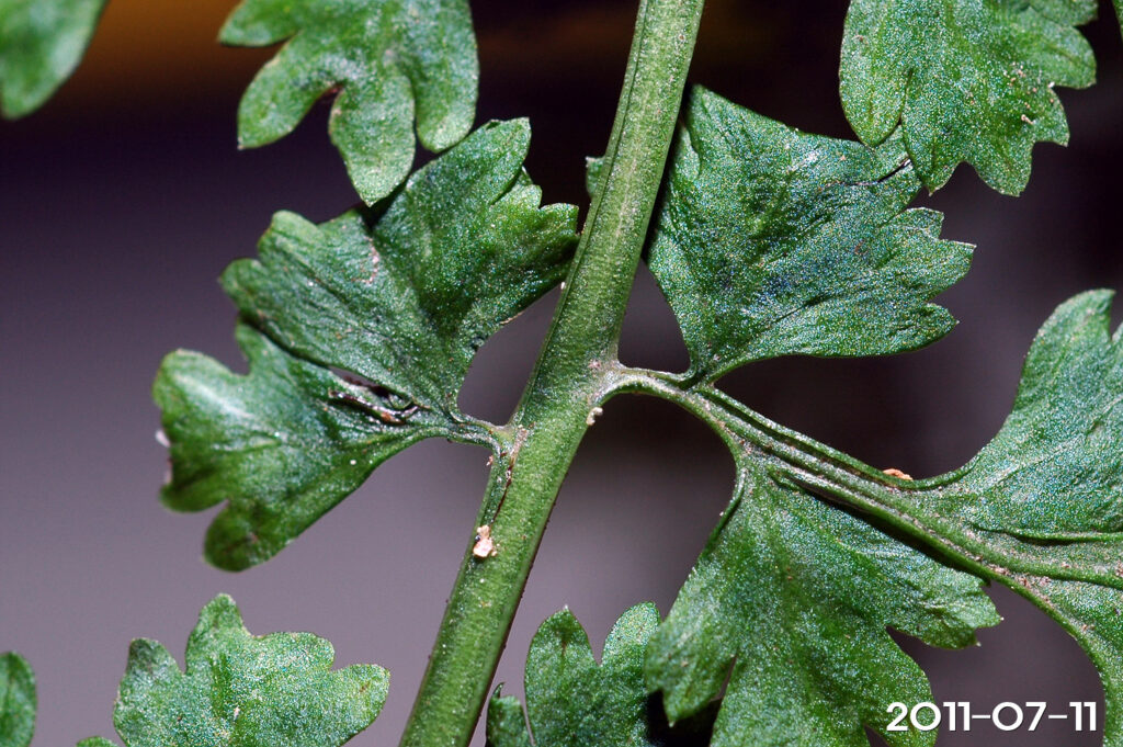 – 잎 모양: 2회 깃꼴로 갈라지며, 도피침형, 길이 8~37cm, 폭 1.1~5.6cm. 깃꼴잎은 삼각상 피침형 또는 난형, 길이 0.5~3.2cm, 폭 0.5~1.3cm, 짧은 자루가 있음. 갈래조각은 타원형, 부채꼴로 얕게 3갈래로 갈라지며, 가장자리에 짧고 뾰족한 톱니가 있음