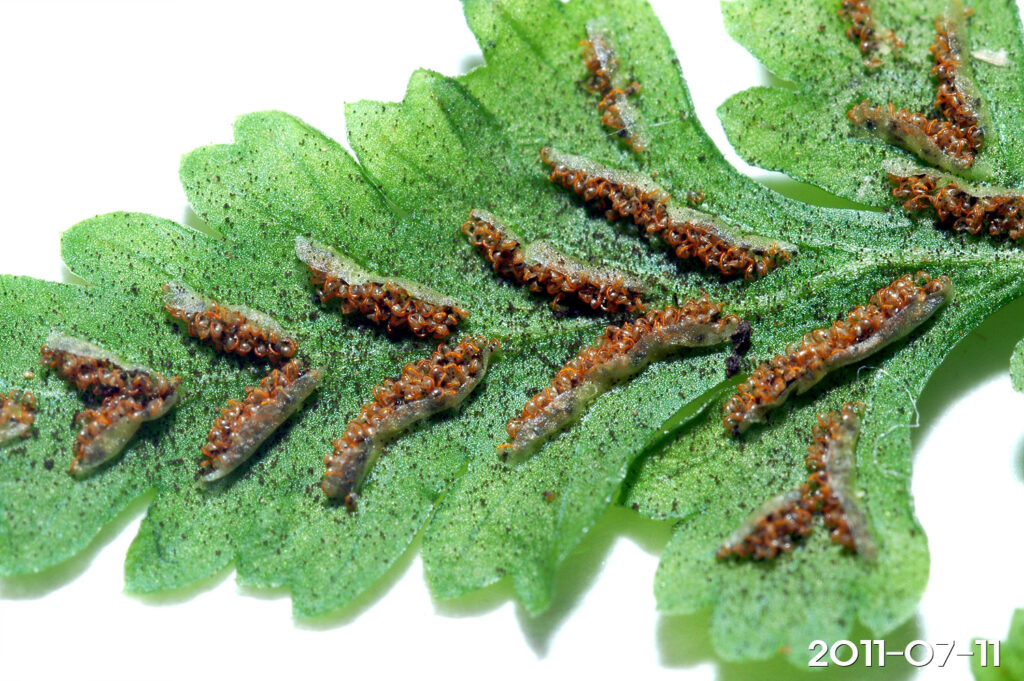 – 포자낭군: 갈래조각의 가운데 잎줄 가까이에 달리며 위쪽으로는 붙지 않음