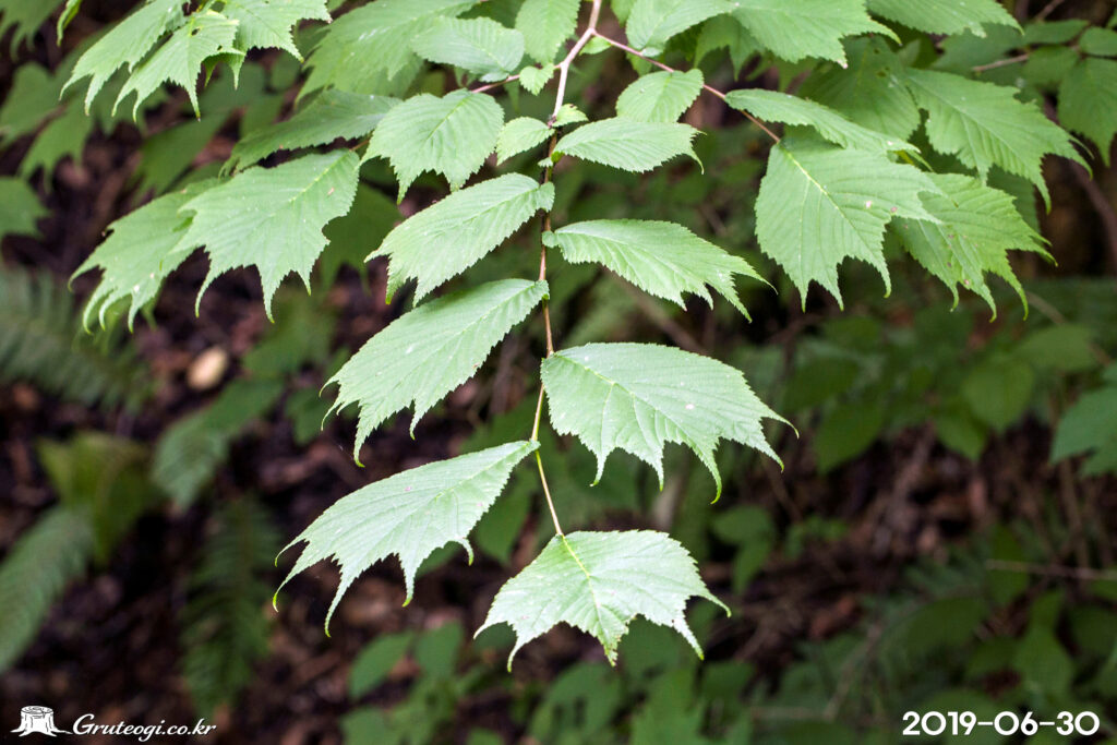 – 잎: 어긋나기, 넓은 도란형, 길이 7~20cm, 폭 4.5~13cm, 끝이 뾰족한 것도 있지만 보통은 3~7갈래로 꼬리처럼 갈라짐. 잎밑은 좌우가 다르고, 가장자리에 예리한 겹톱니가 있음. 잎 양면에 잔털이 있으며, 잎자루는 길이 2~7mm, 잔털이 있음