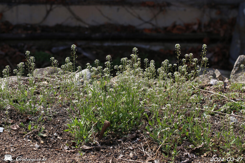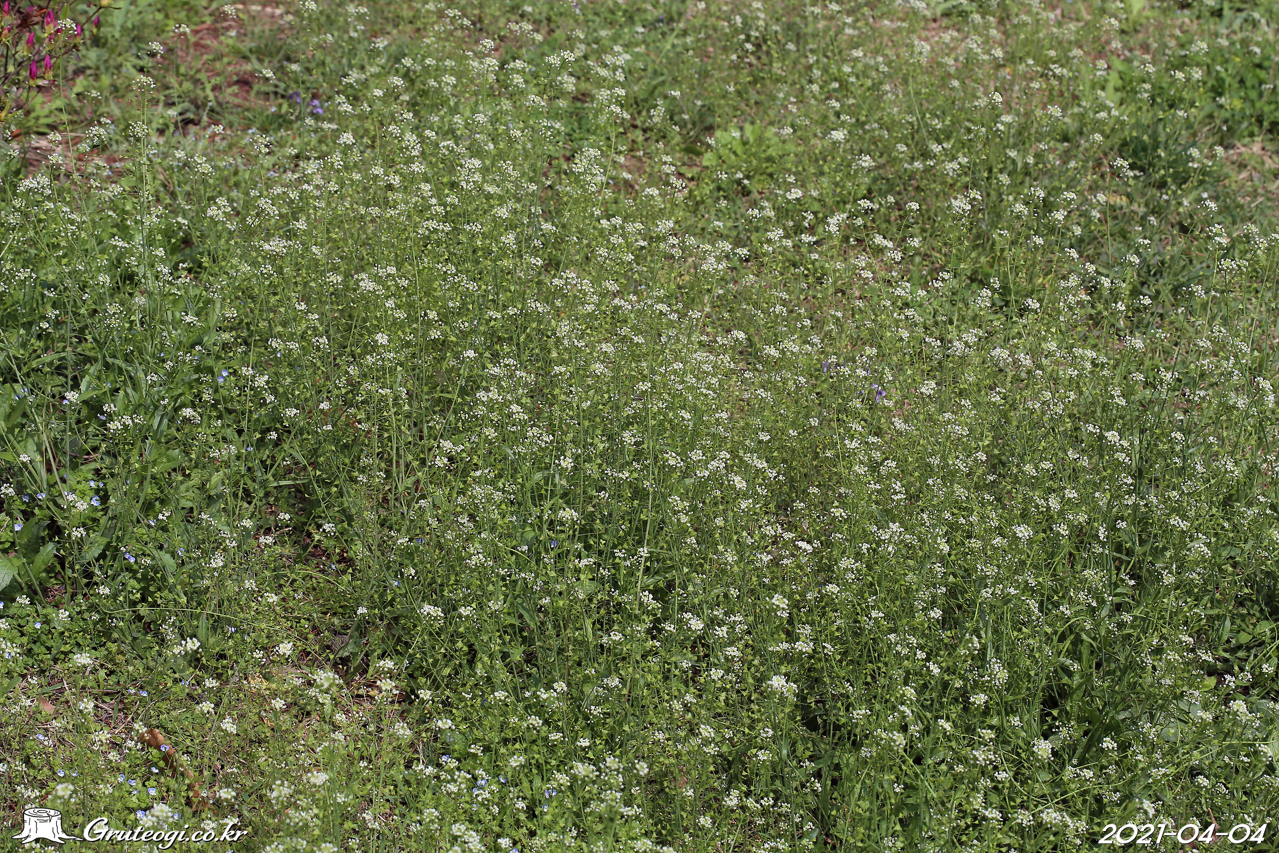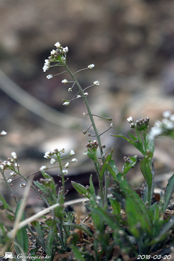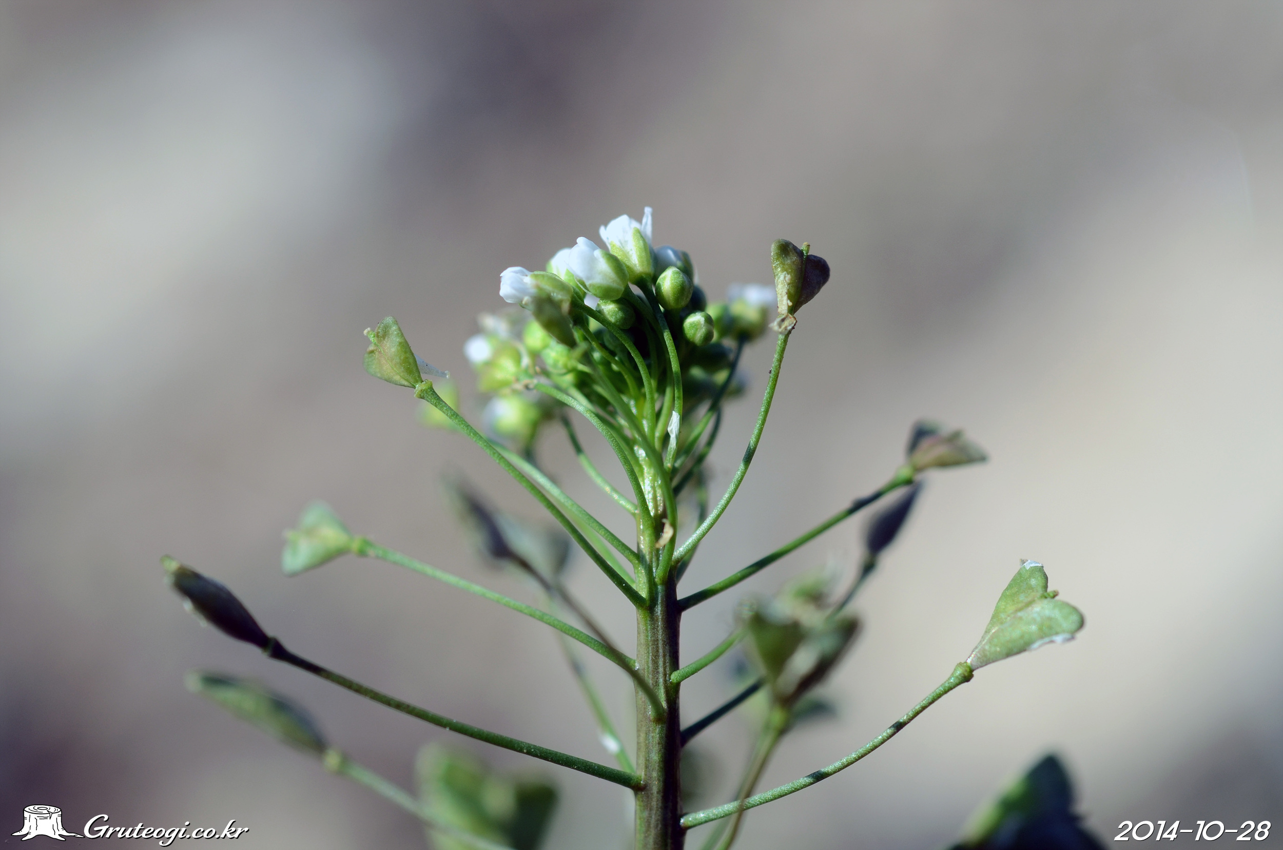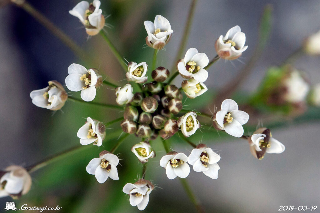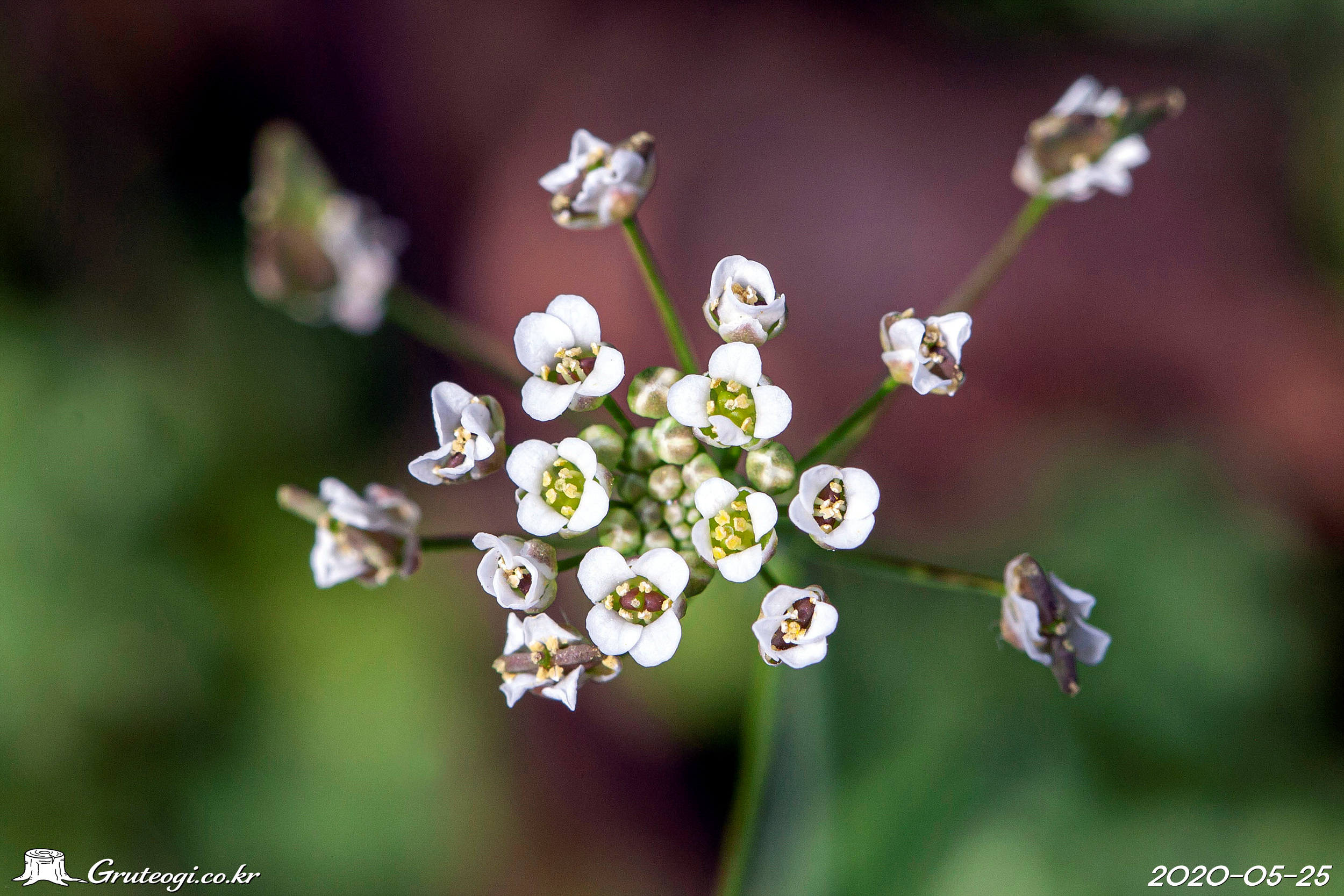 – 꽃: 2~11월, 흰색, 줄기와 가지 끝의 총상꽃차례에 달림. 꽃받침잎은 4장, 타원형. 꽃잎은 4장, 주걱 모양, 길이 2.0~2.5mm
