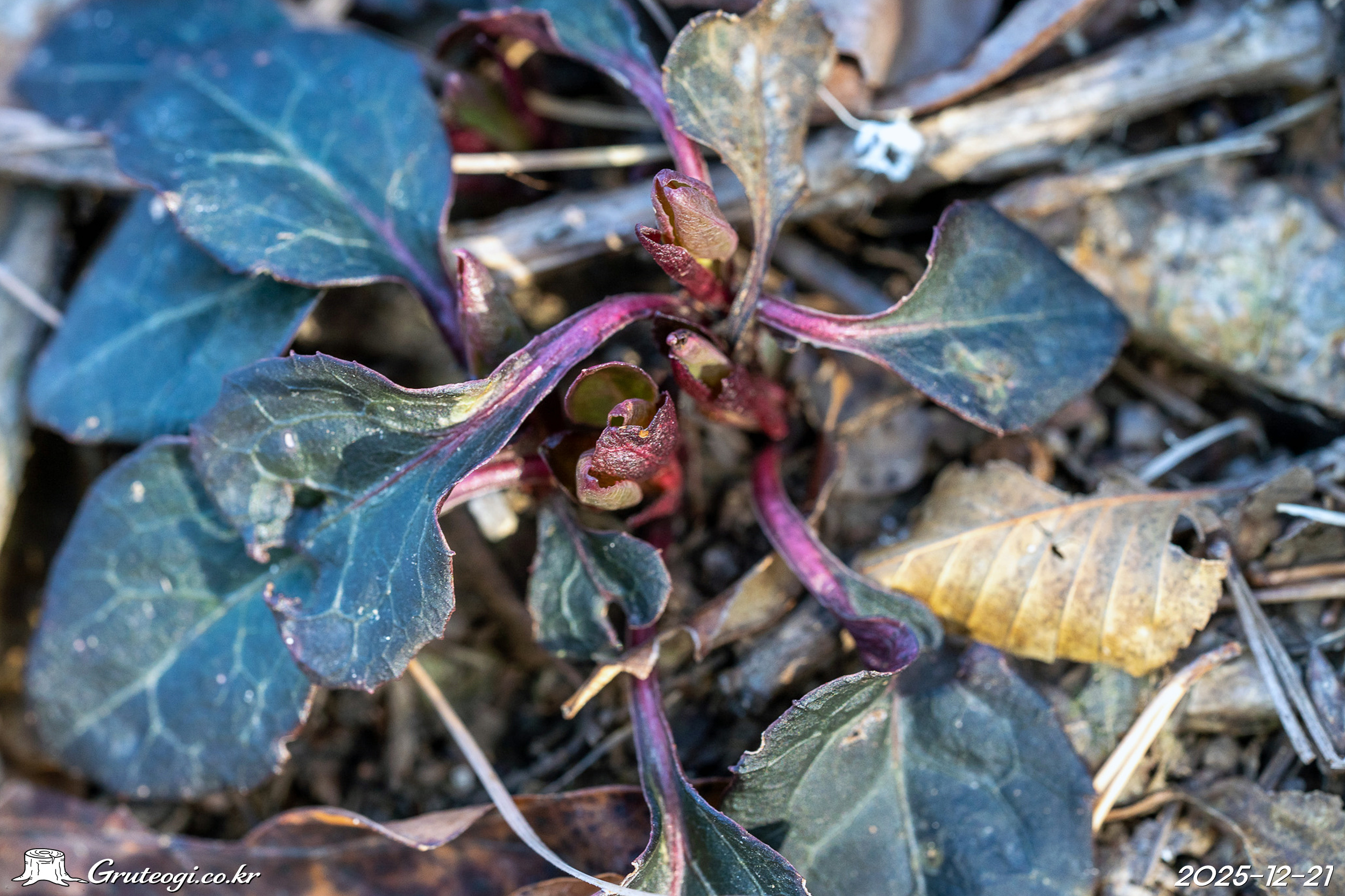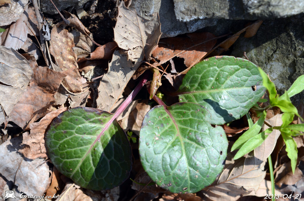 – 잎: 1~8개가 밑부분에서 모여나기, 원형 또는 넓은 타원형. 길이 4~7㎝, 넓이 2.5~4.5㎝. 둔두 둔저, 흔히 엽병과 더불어 자줏빛이 돌고 표면은 엽맥부가 연한 녹색. 가장자리에는 낮은 톱니, 엽병은 길이 3~8㎝
