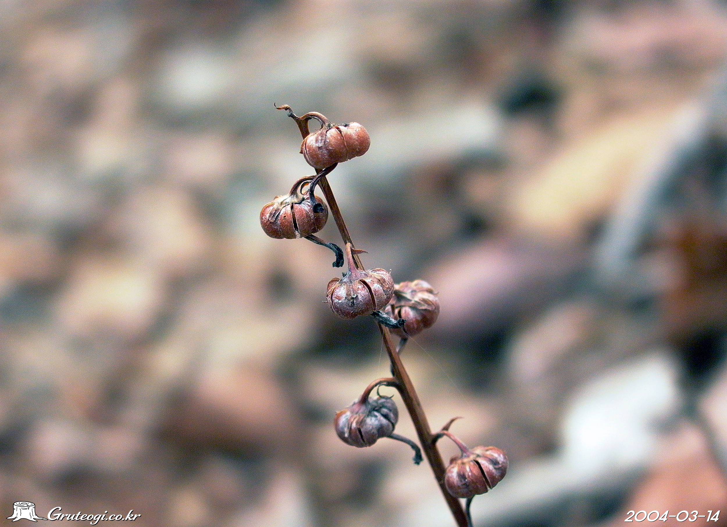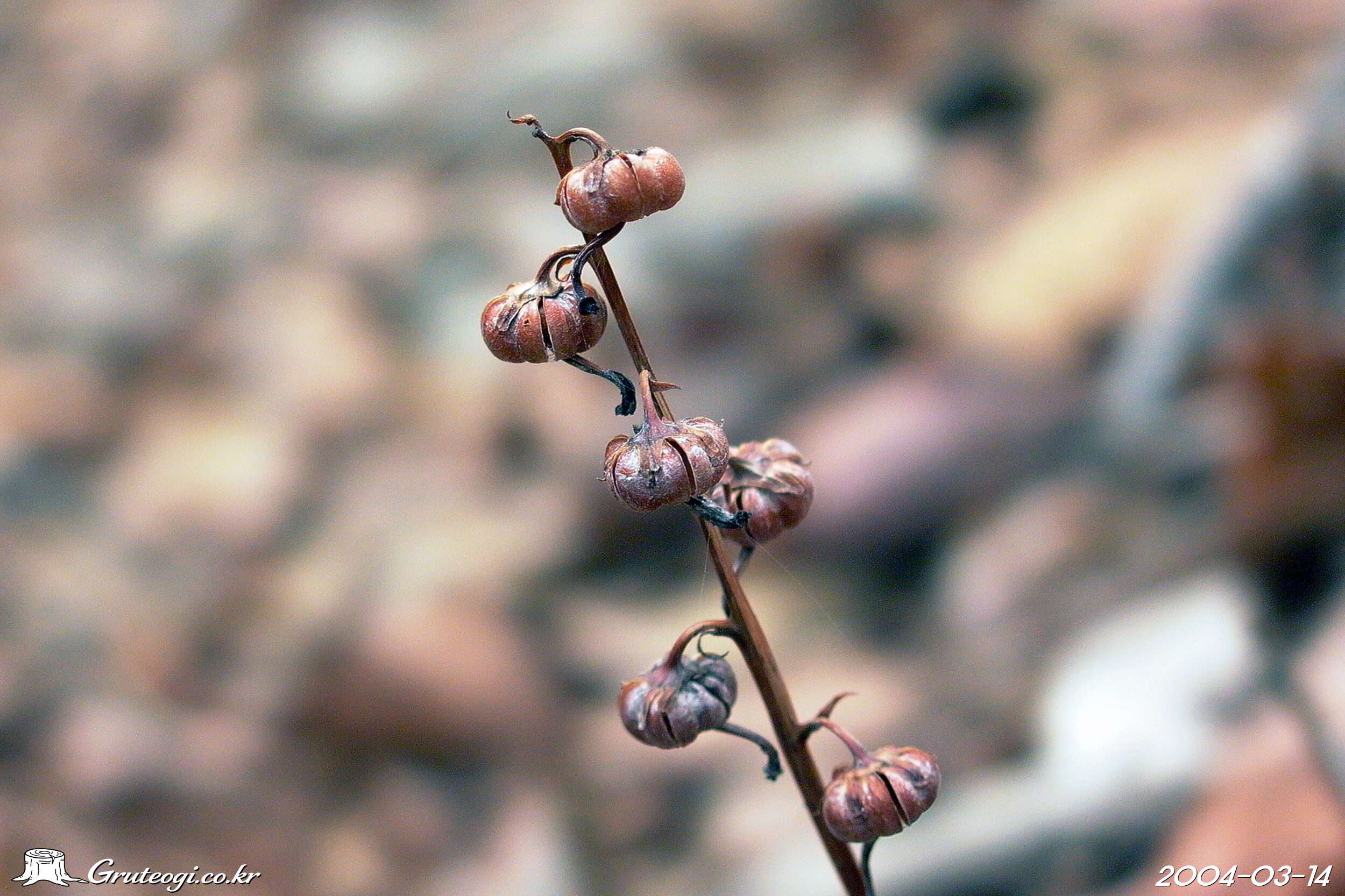 – 열매: 삭과, 지름 7~8㎜, 편평한 구형, 익으면 5개로 갈라지고 갈색으로 익음