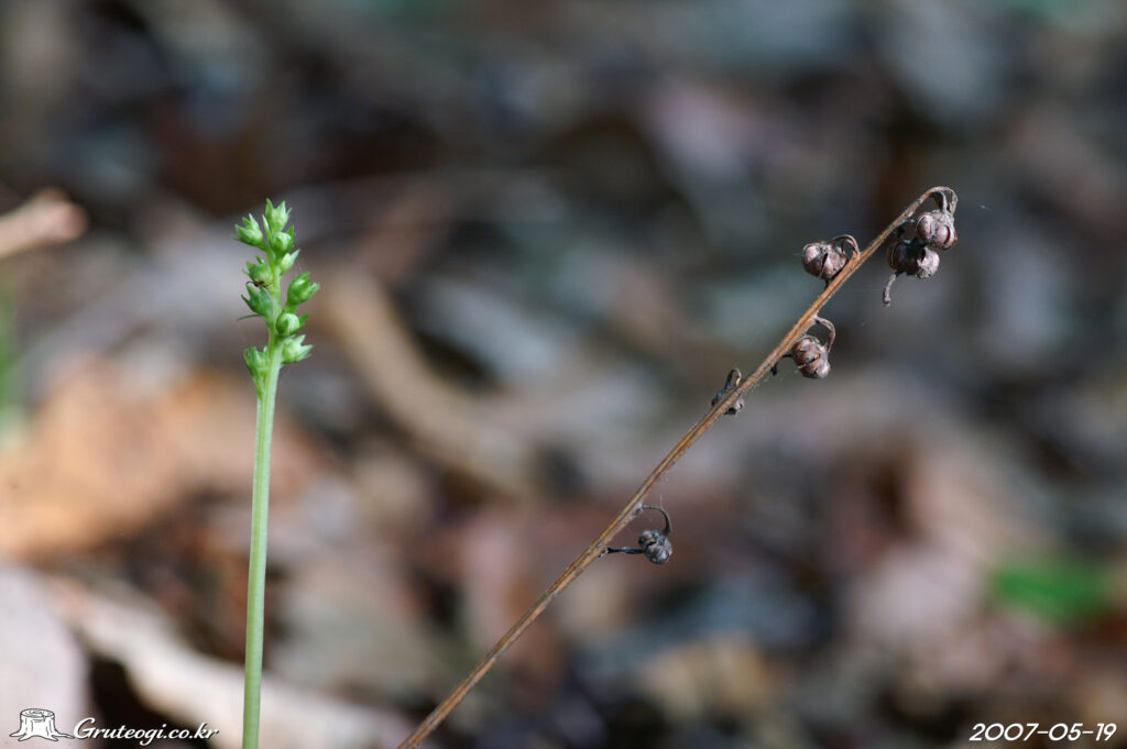 – 꽃: 꽃대는 길이 10~25㎝, 능선이 있고, 1~2개의 인엽이 있으며, 윗부분에 2~12개의 꽃이 총상으로 달림. 꽃은 지름 12~15㎜, 백색으로 개화. 꽃잎은 5개, 수술은 10개, 암술이 길게 나와 끝이 위로 굽음