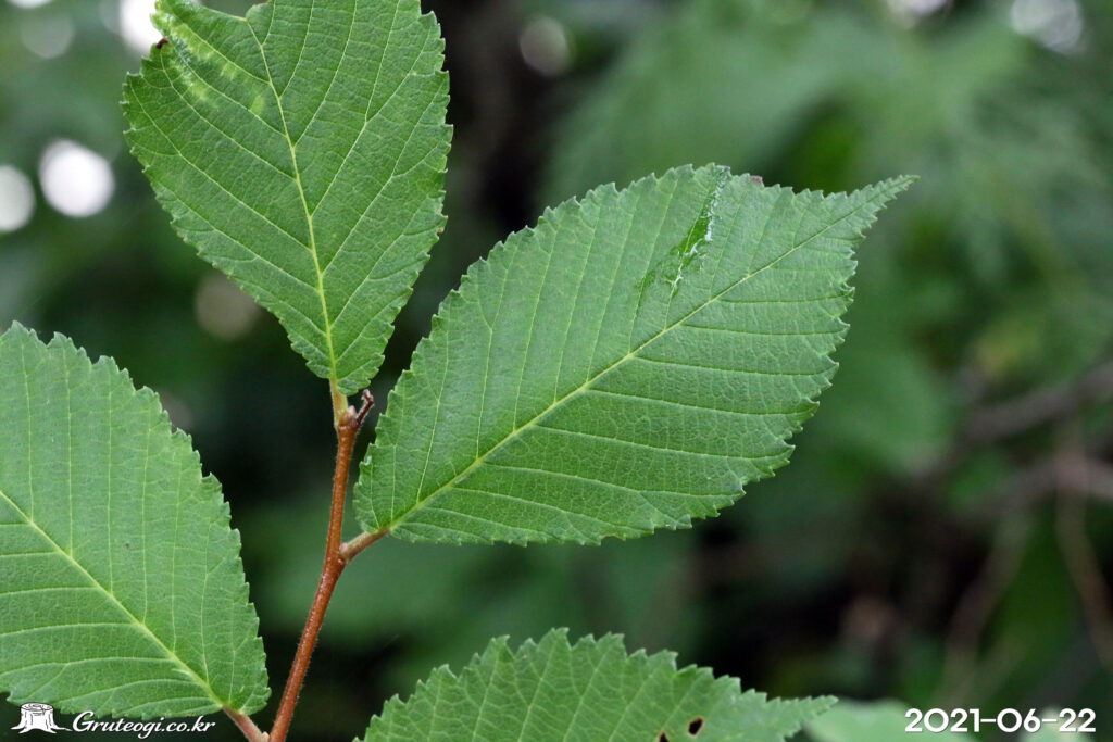 – 잎: 어긋나기, 타원형 또는 도란형, 길이 3-10cm, 너비 2-6cm, 가장자리에 겹톱니가 있음, 표면은 거칠고, 뒷면 맥 위에 털이 있음, 측맥은 10~16쌍, 엽병은 길이 3~7㎜