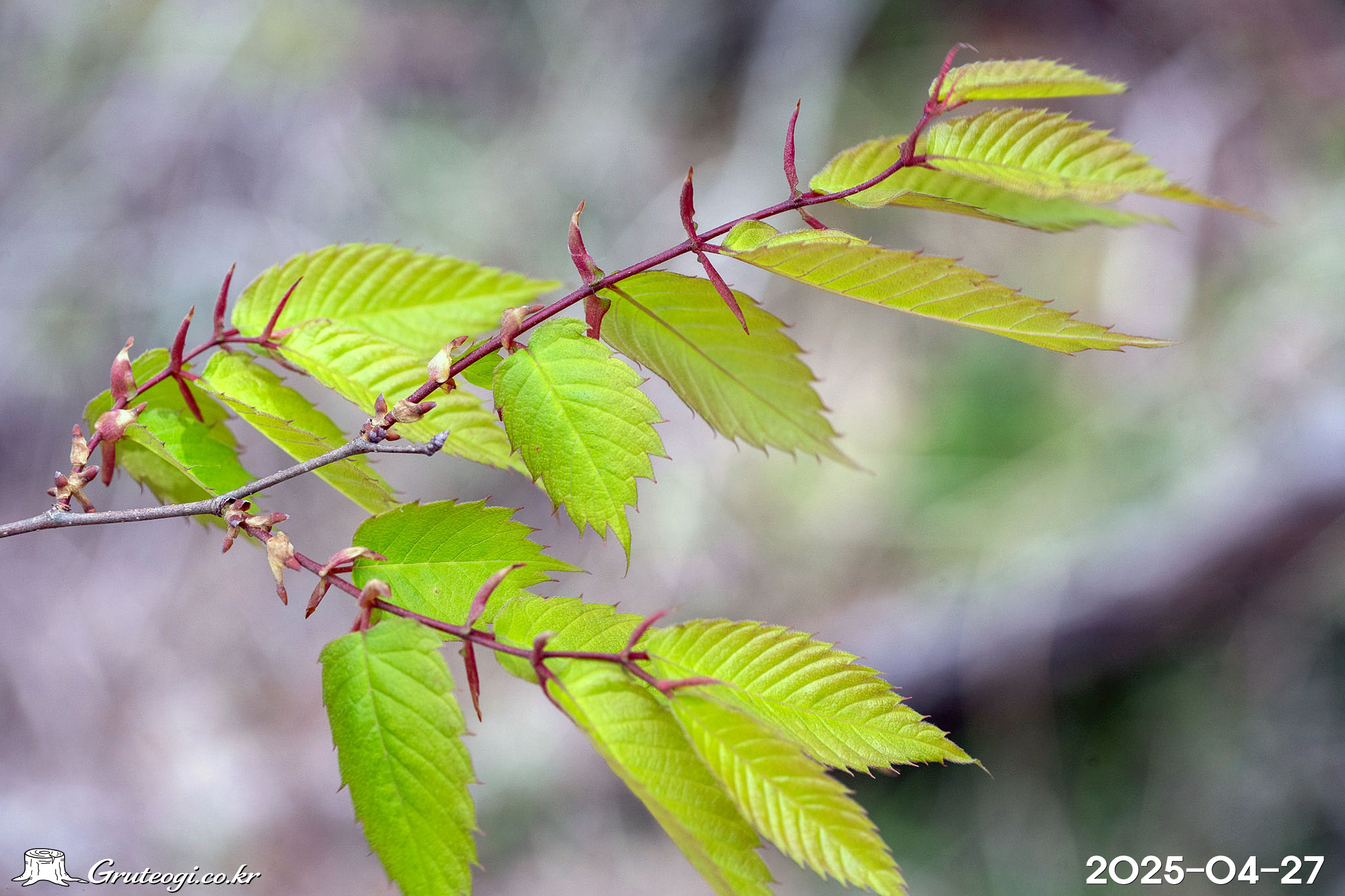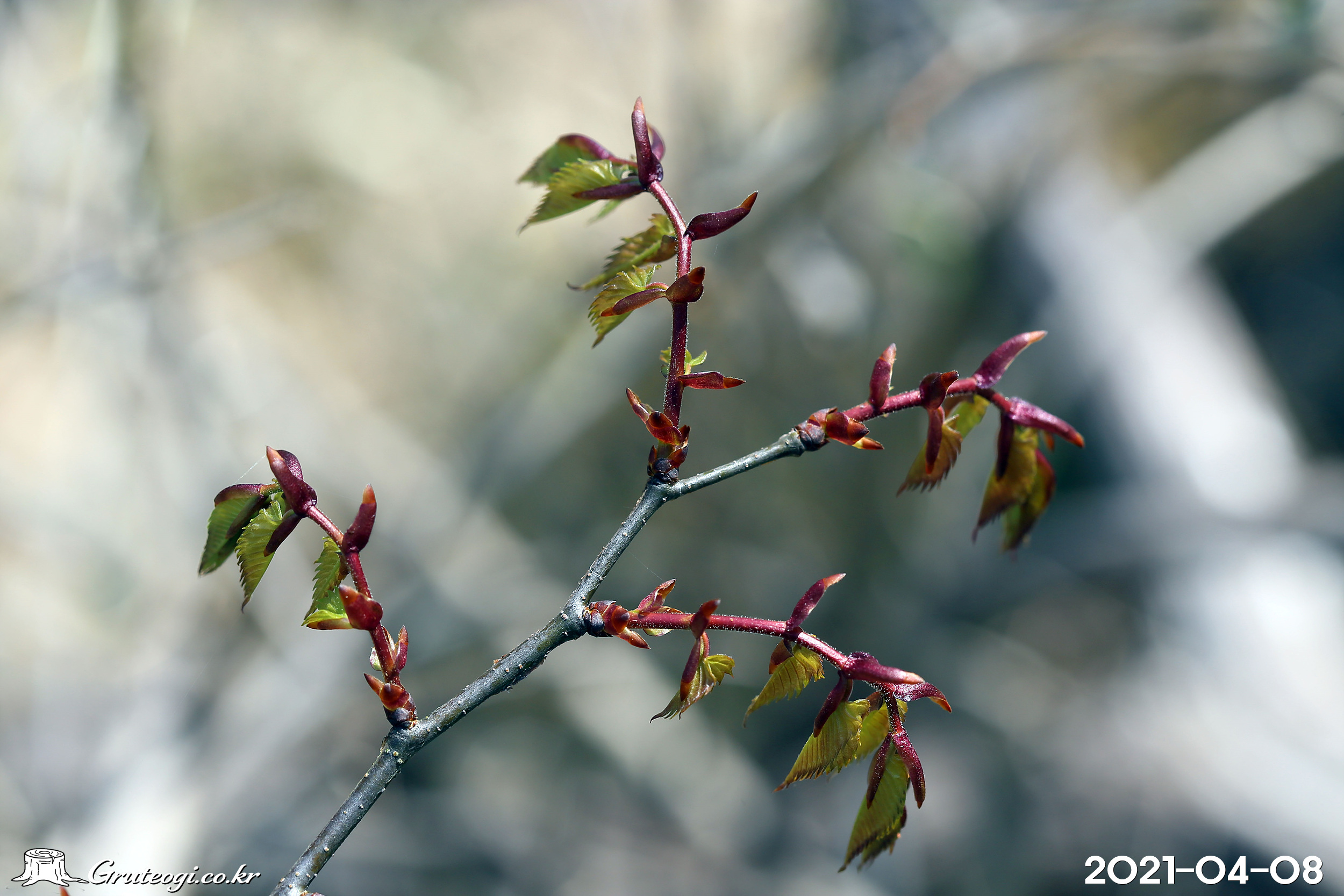 – 꽃: 담황록색, 암수한그루, 4~5월초, 취산꽃차례로 달림. 수꽃은 새가지 밑에 모여 달리며 4~6개로 갈라진 화피와 4~6개의 수술이 있음, 암꽃은 새가지 윗부분에 1송이씩 달리며 퇴화된 수술과 2개로 갈라진 암술이 있음