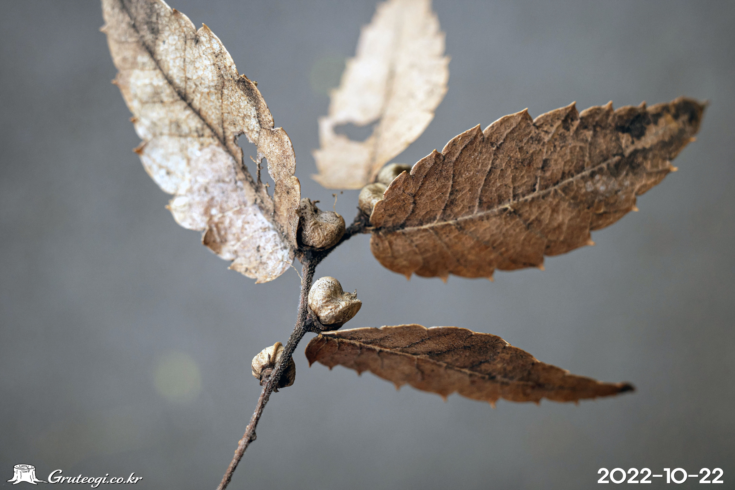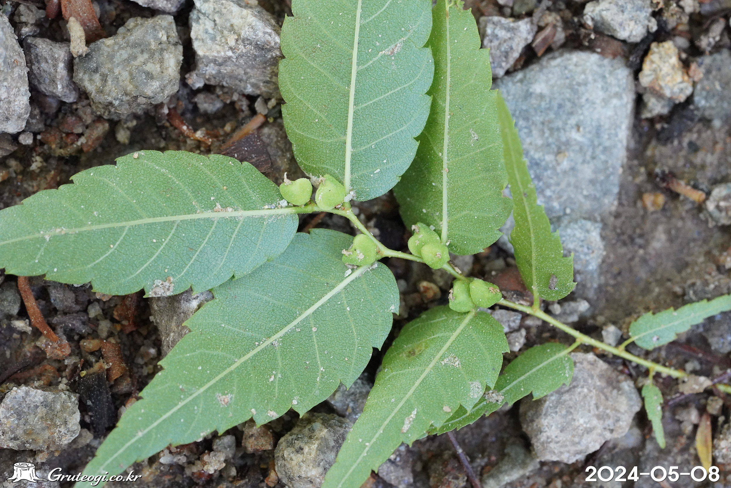 – 열매: 핵과, 대가 거의 없이 일그러진 편구형, 지름 4㎜, 뒷면에 능선이 있음, 10월에 익음