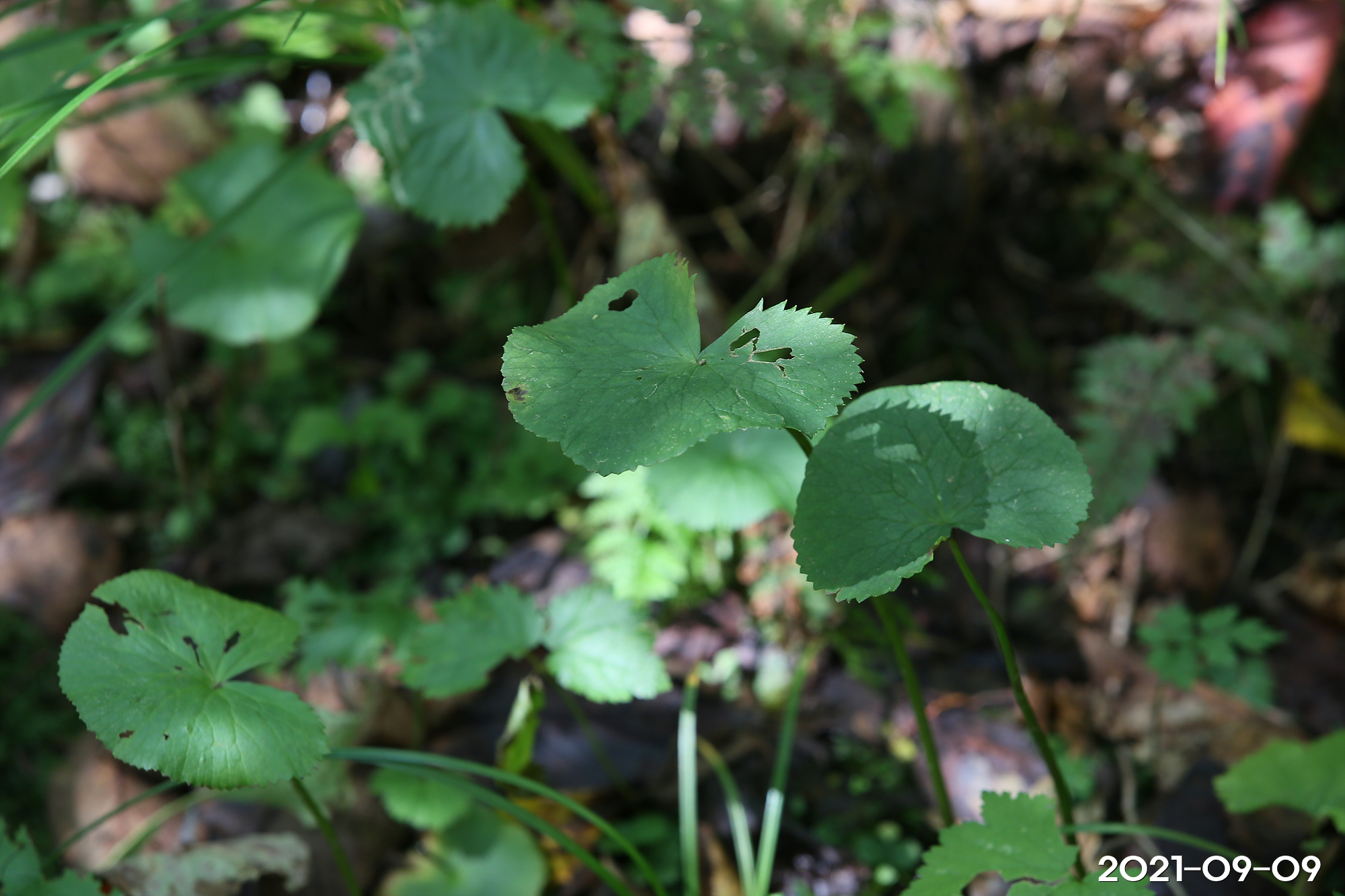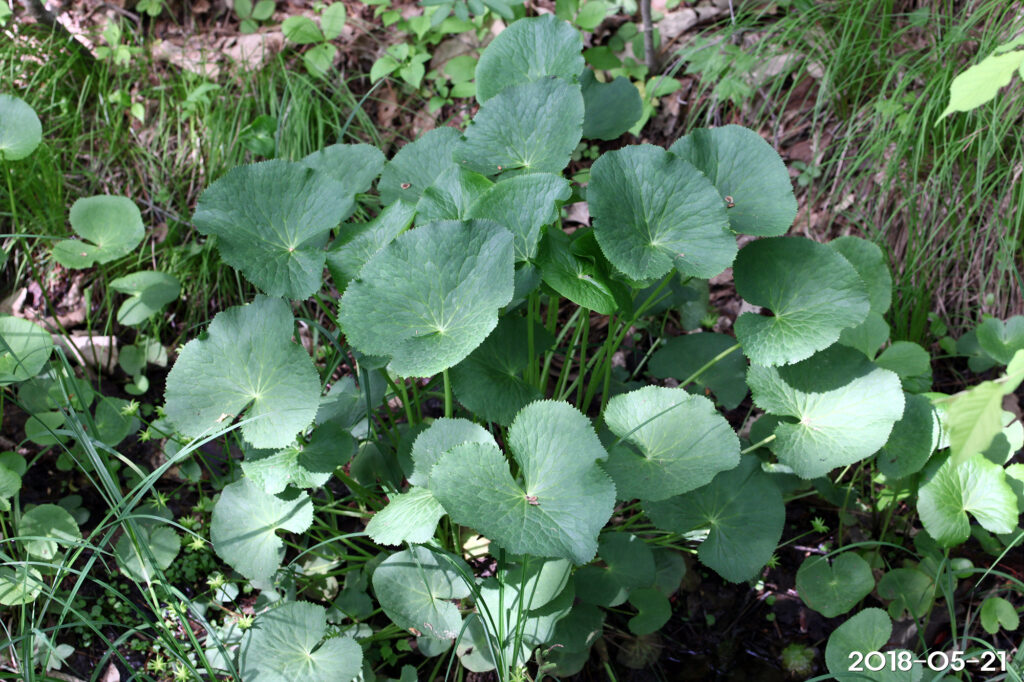 – 잎: 뿌리잎은 모여나며, 잎자루가 길고, 둥근 심장형으로 큰 것은 지름 20cm에 이름. 줄기잎은 잎자루가 짧거나 없음