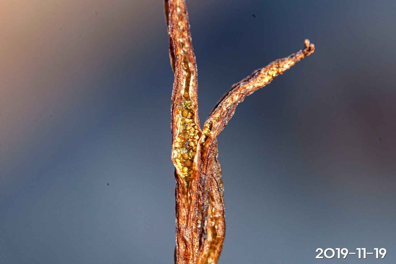 – 포자낭군: 길이 0.5-11.5cm, 너비 0.4-0.9cm로 긴 선형, 엽맥을 따라 붙고, 잎 가장자리가 말려서 포자낭군을 덮음
