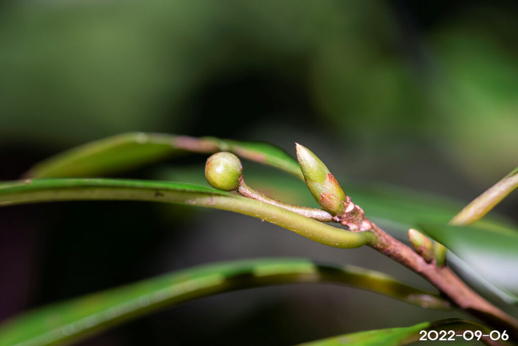 – 잎: 어긋나기, 도피침형, 길이 6~13cm, 너비 1.5~2.5cm. 양 끝 뾰족, 가장자리 밋밋, 표면은 윤채가 나고 뒷면은 녹백색