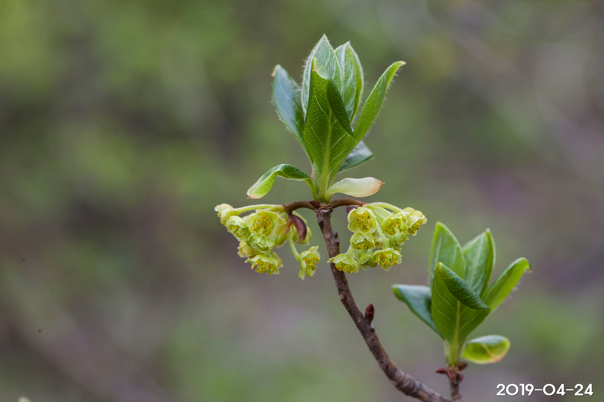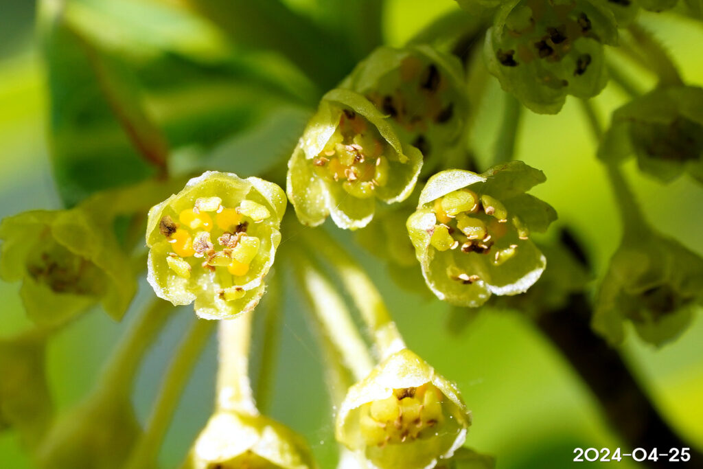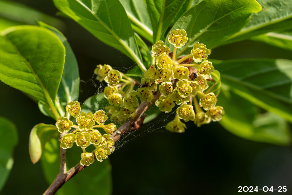 – 꽃: 암수딴그루, 4~5월, 잎보다 먼저 개화, 새가지 밑의 잎겨드랑이에서 나는 산형꽃차례에 많이 달림, 연한 황색