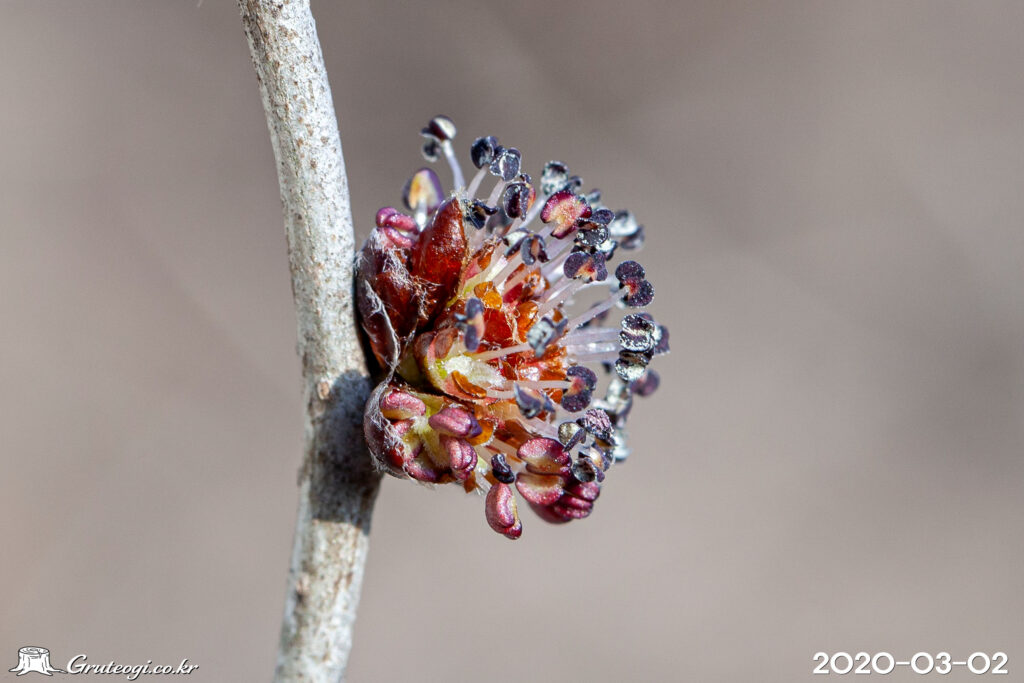 – 꽃: 3~4월, 잎보다 먼저 개화, 잎겨드랑이에 여러 개가 모여 달림. 화피는 4~5갈래로 갈라짐. 꽃밥은 보라색