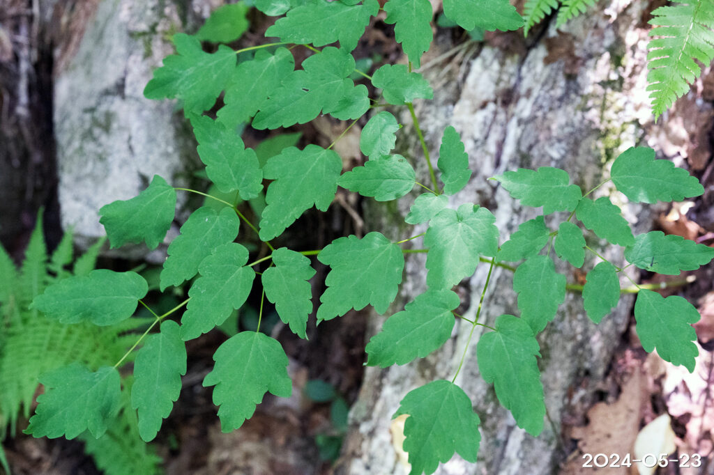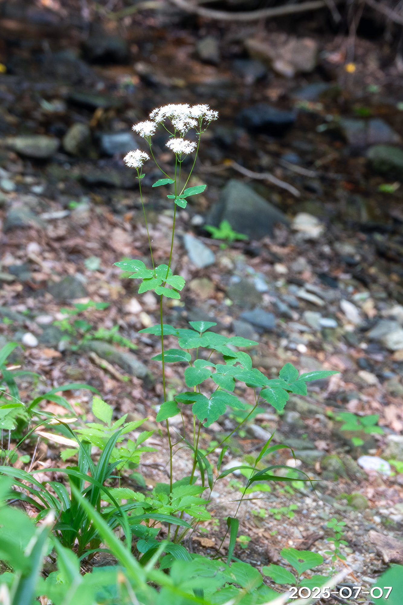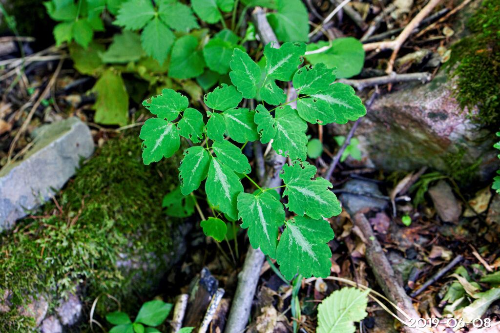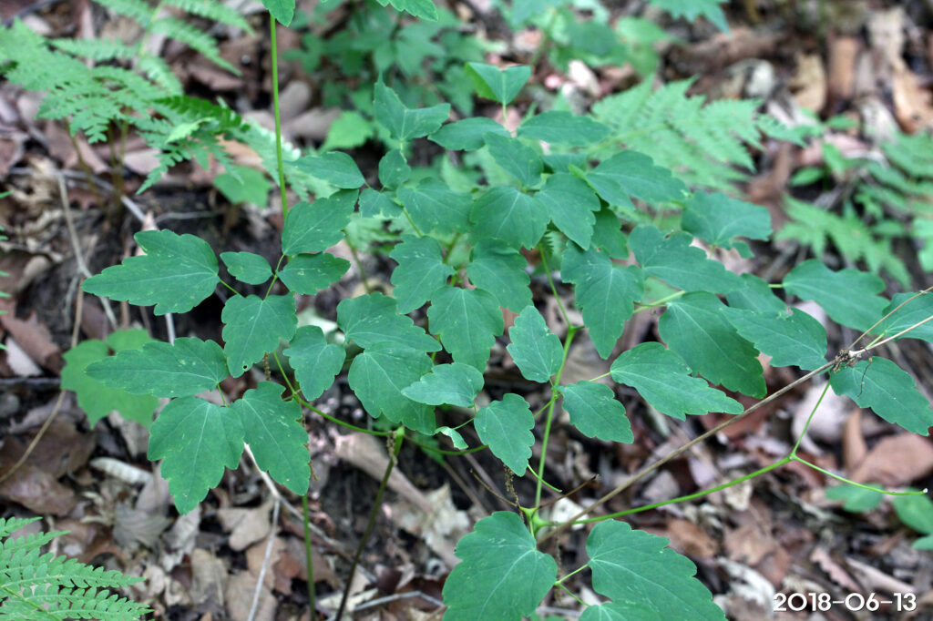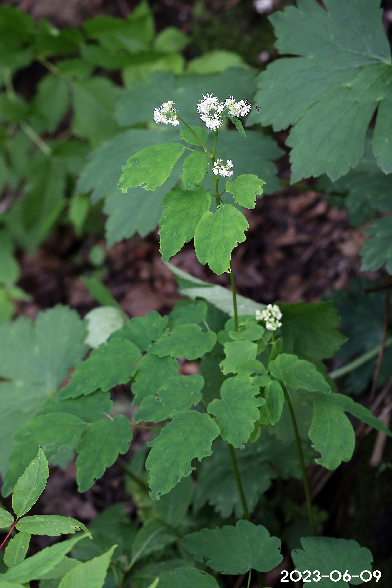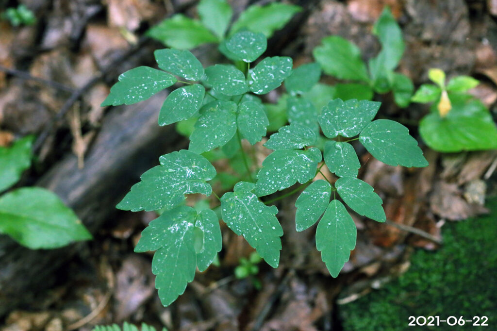 – 잎: 뿌리잎은 1장, 2회 3출겹잎, 길이 15~22cm. 잎자루는 길이 7~13cm. 줄기잎은 2장이 마주나며, 작고, 잎자루가 없음