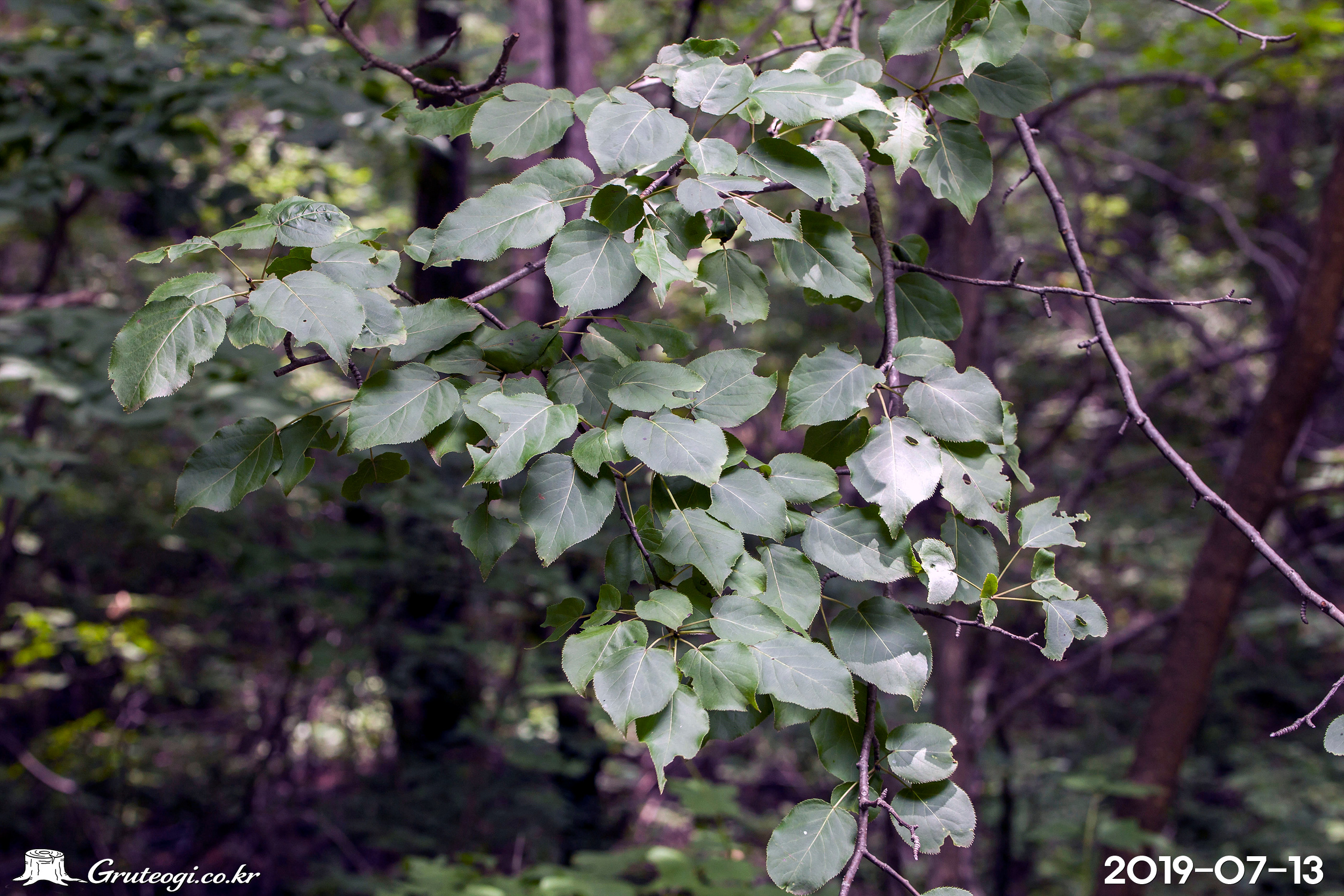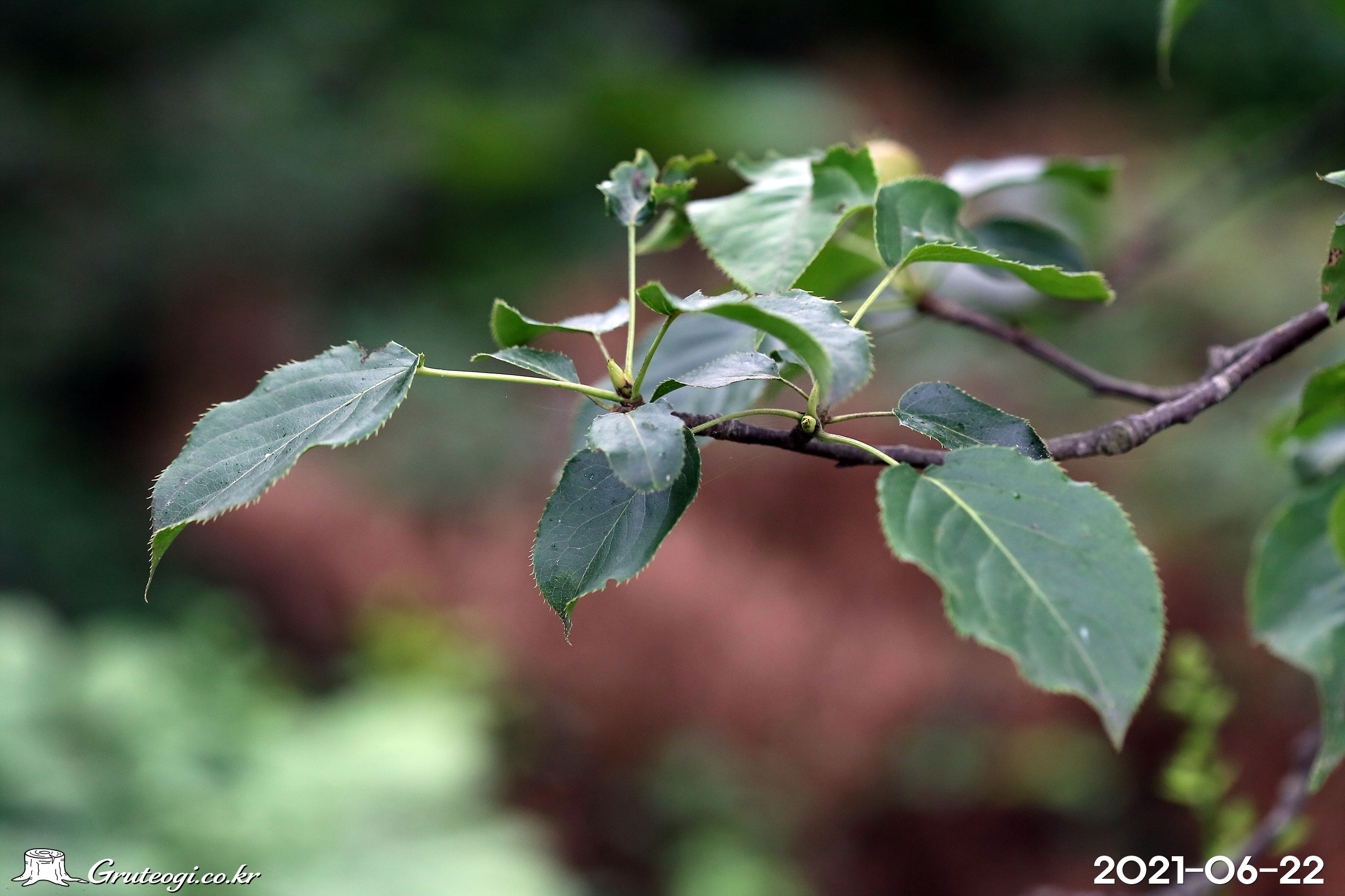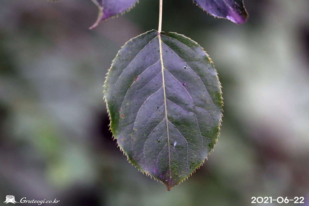 – 잎: 어긋나기, 넓은 난형 또는 둥근 난형, 길이 4~10cm, 폭 3.5~6cm, 끝은 날카롭고 가장자리에 바늘 모양의 톱니가 있음. 잎 양면은 진한 녹색, 털이 없으며 윤기가 남