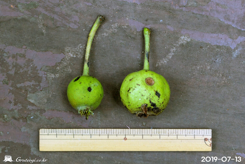 – 열매: 이과, 둥글며, 9월에 익음