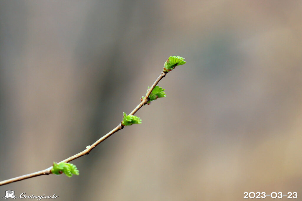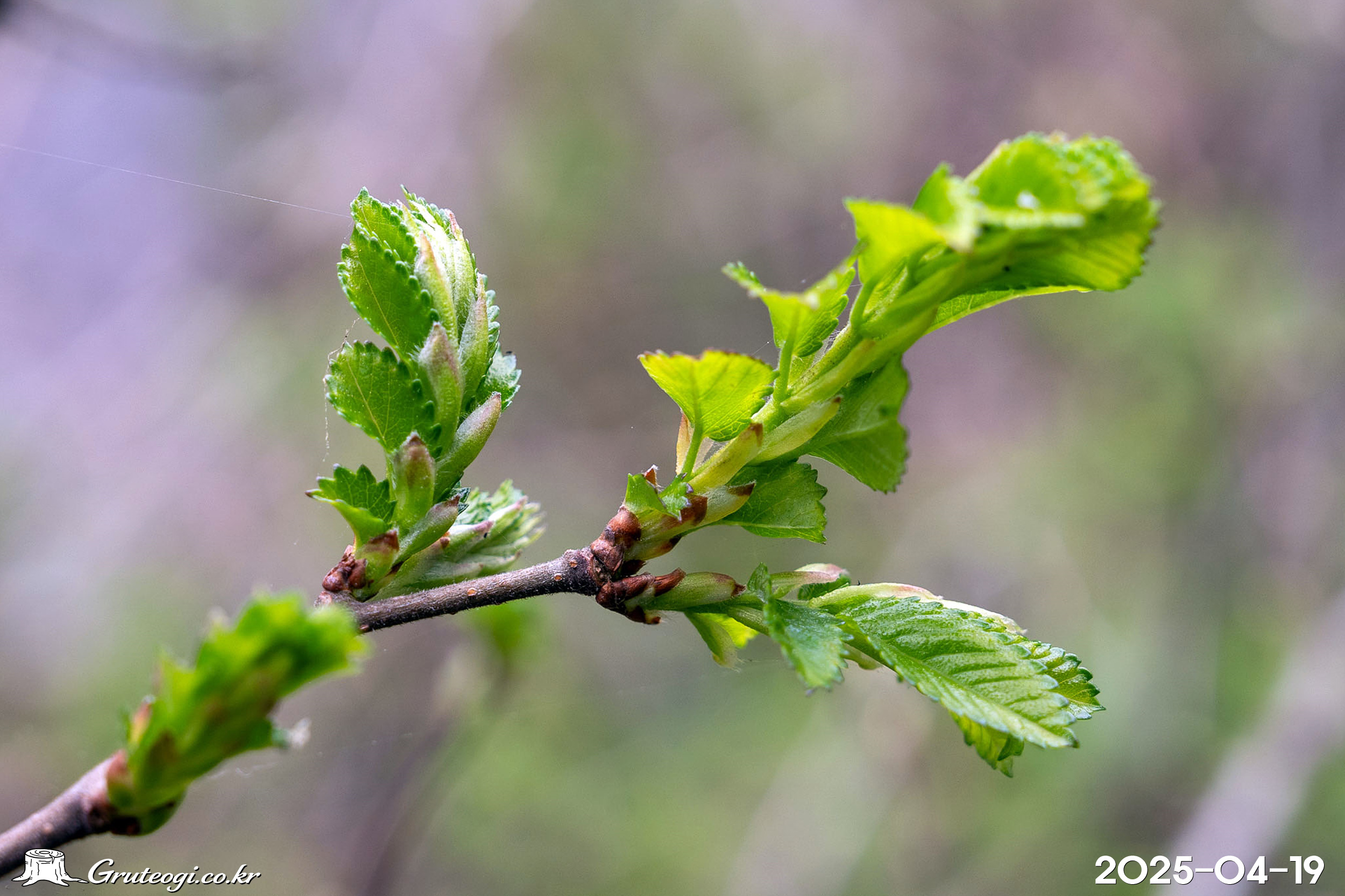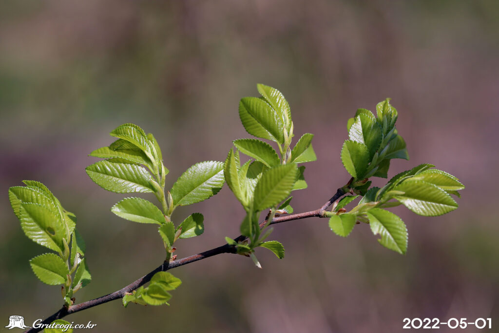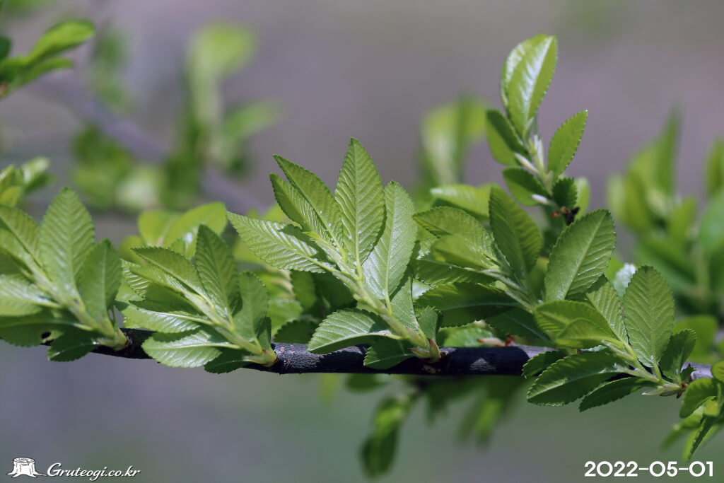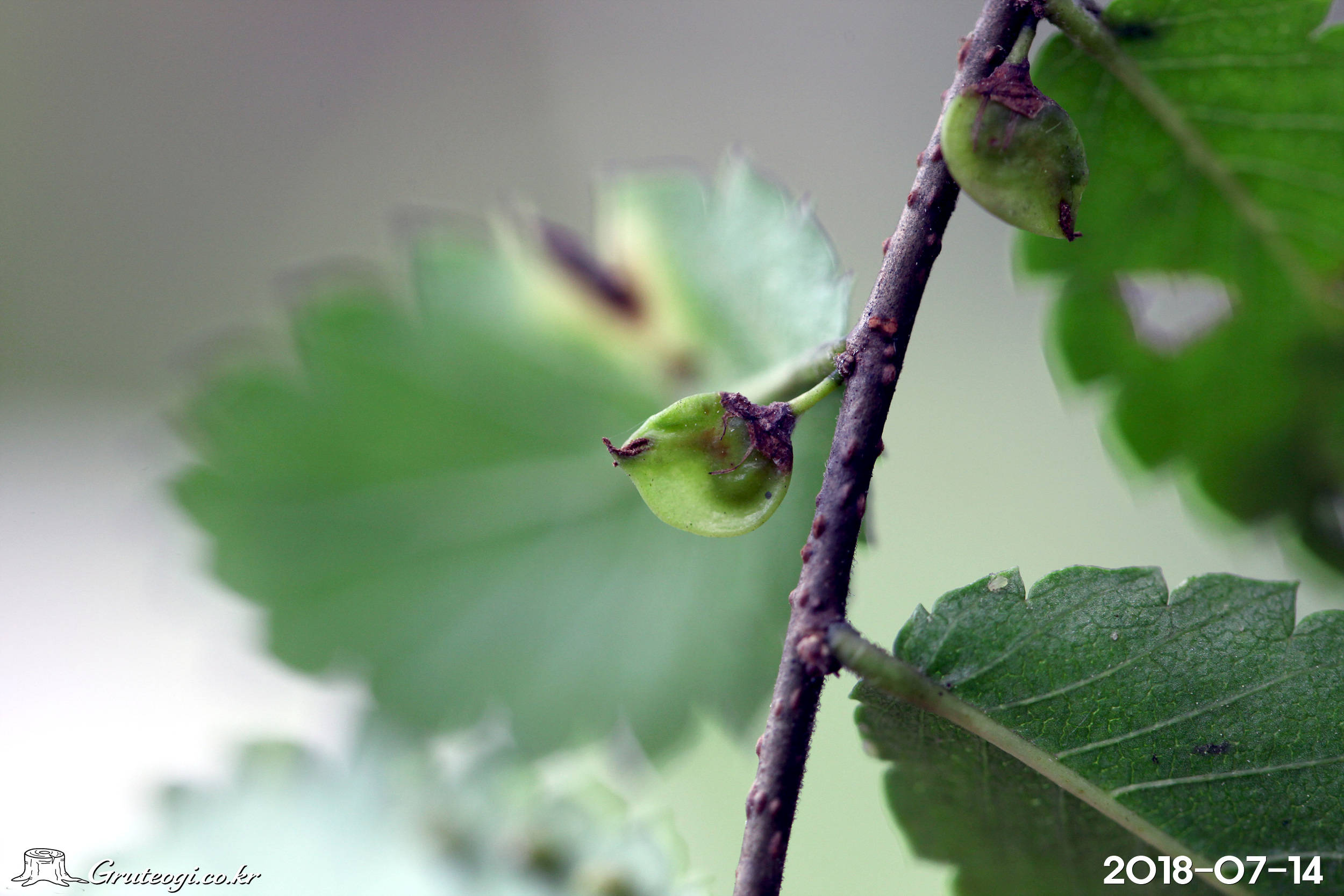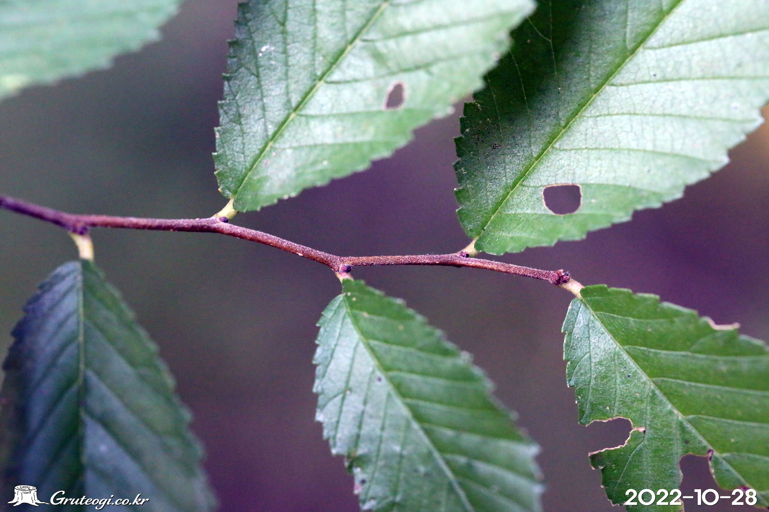 – 잎: 긴 타원형, 길이 3~6cm, 폭 1.7~2.6cm, 끝은 둔하게 뾰족, 밑은 얕은 신장형, 가장자리에 고른 톱니가 있음. 잎자루는 길이 2~4mm, 잔털이 있음. 측맥은 8~15쌍. 턱잎은 긴 타원형으로 일찍 떨어짐