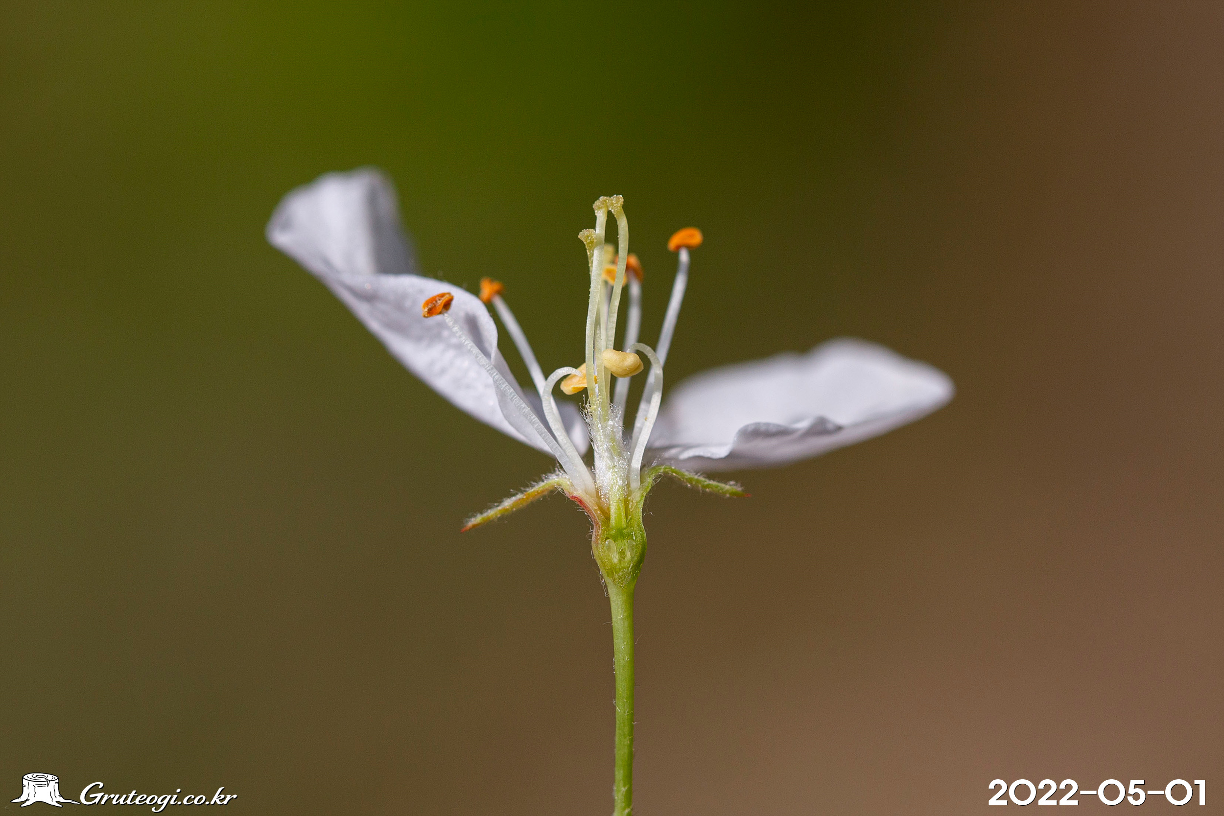 – 꽃: 5월 중순, 연한 홍색이 도는 흰색, 지름 3cm 정도, 짧은가지에서 나오는 산형꽃차례에 4~5개씩 달림. 꽃자루는 길이 3cm 정도, 털이 있음. 꽃받침통은 길이 4mm, 털이 조금 있음