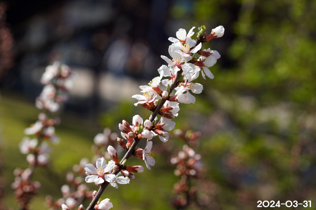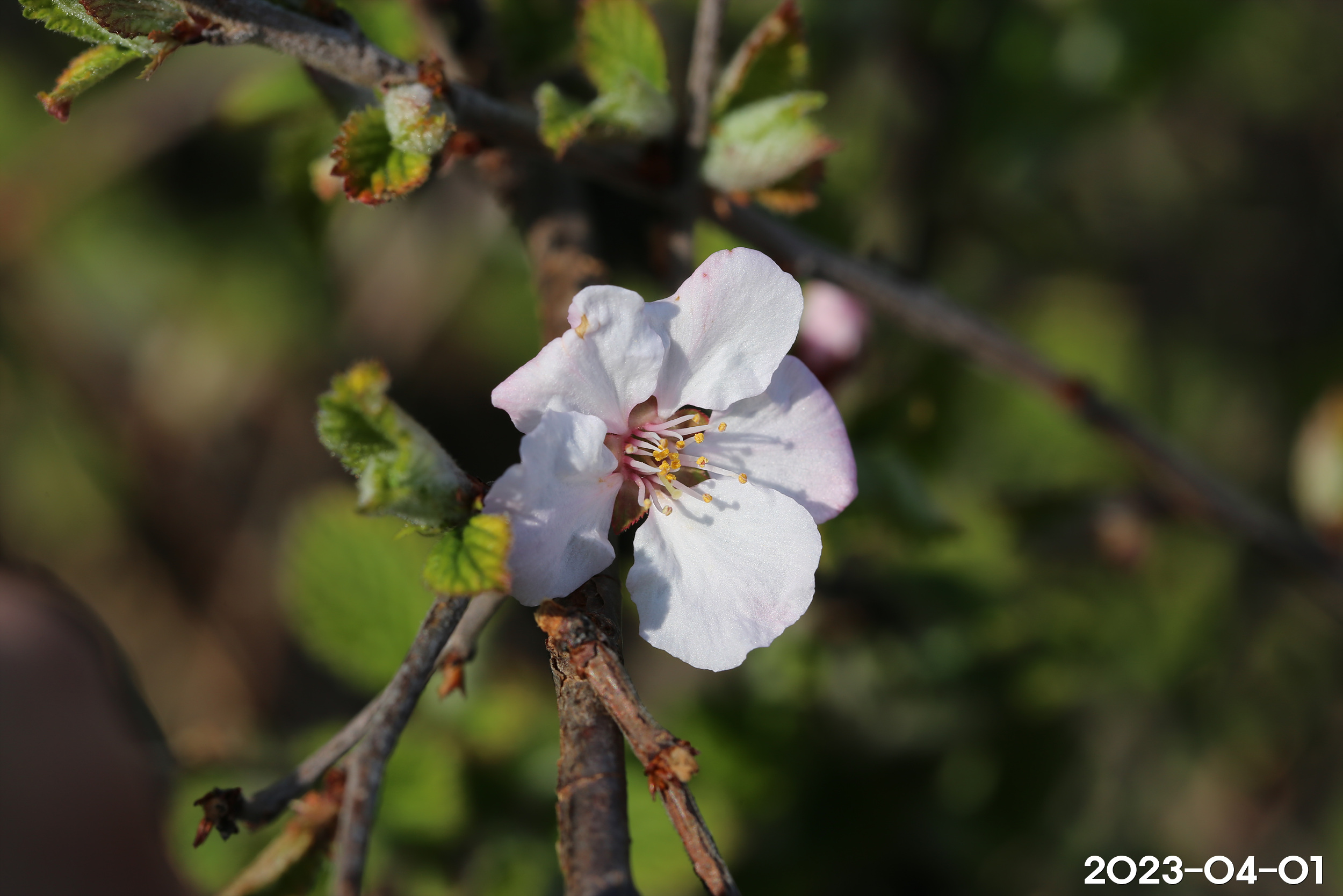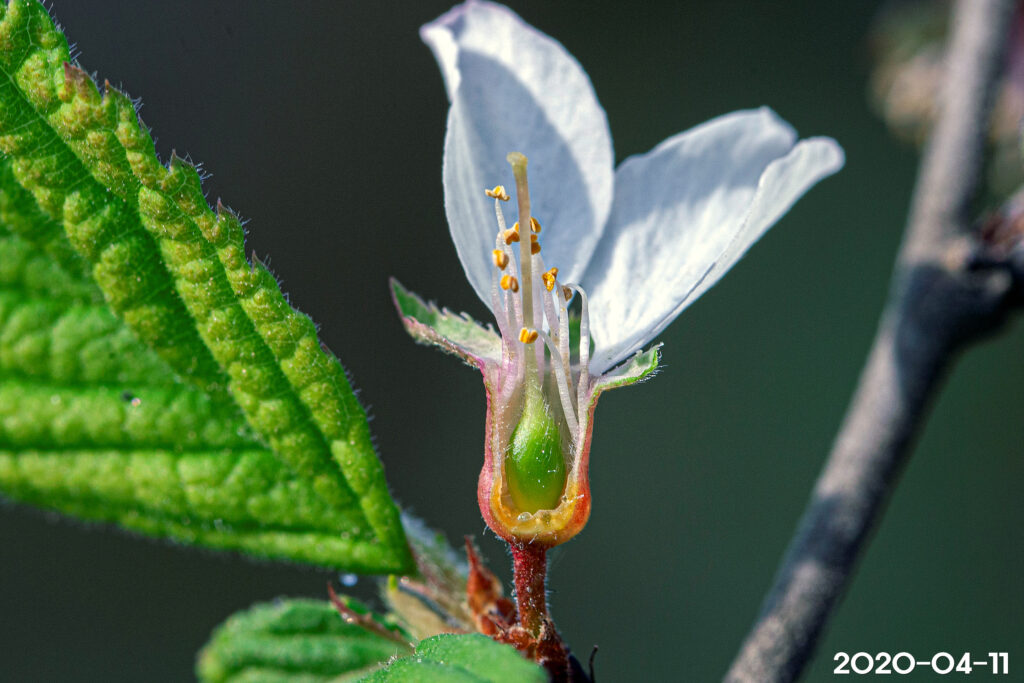 – 꽃: 4월, 1~2개씩 달리며, 길이 1.5~2.0cm, 흰색 또는 분홍색. 꽃자루는 길이 2mm 미만, 꽃받침조각은 5개, 타원형, 털이 있음. 꽃잎 5장, 넓은 도란형
