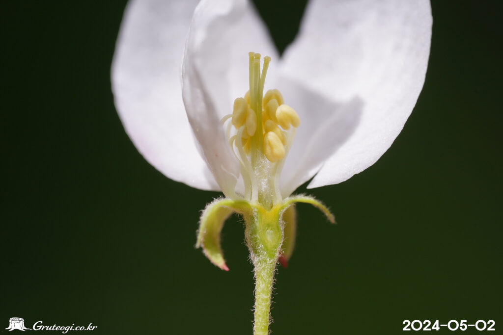– 꽃: 5~6월, 짧은가지 끝의 산형꽃차례로 달림, 흰색, 지름 3~4cm. 꽃자루는 길이 2~5cm. 꽃받침잎은 피침형, 안쪽에 부드러운 털이 있고, 꽃이 진 다음 떨어짐