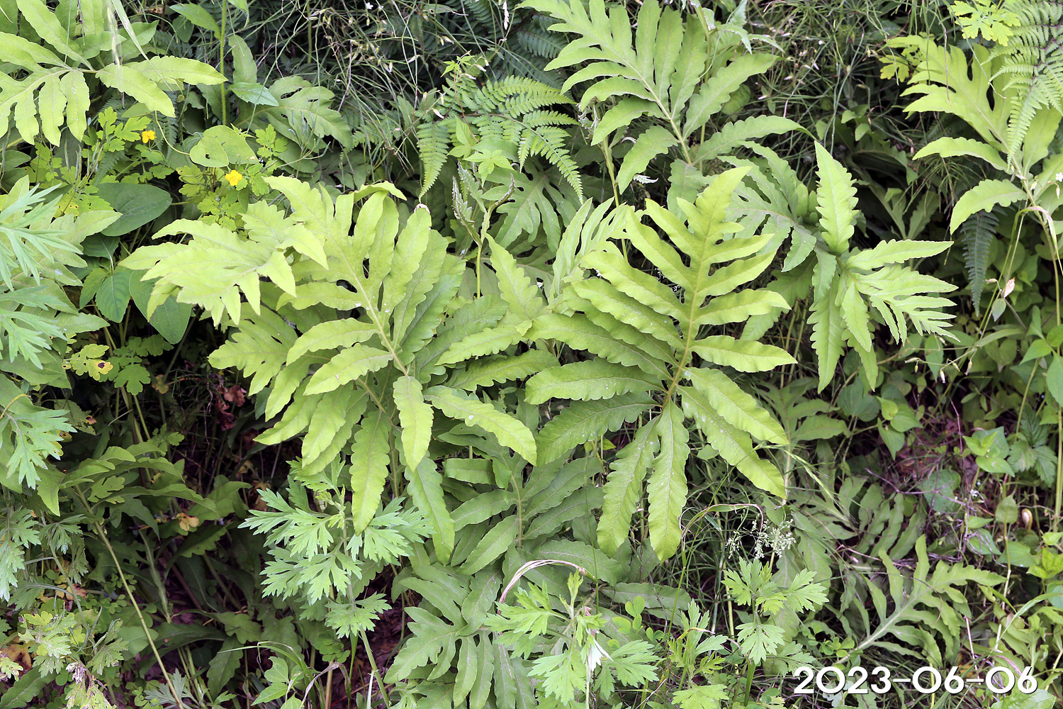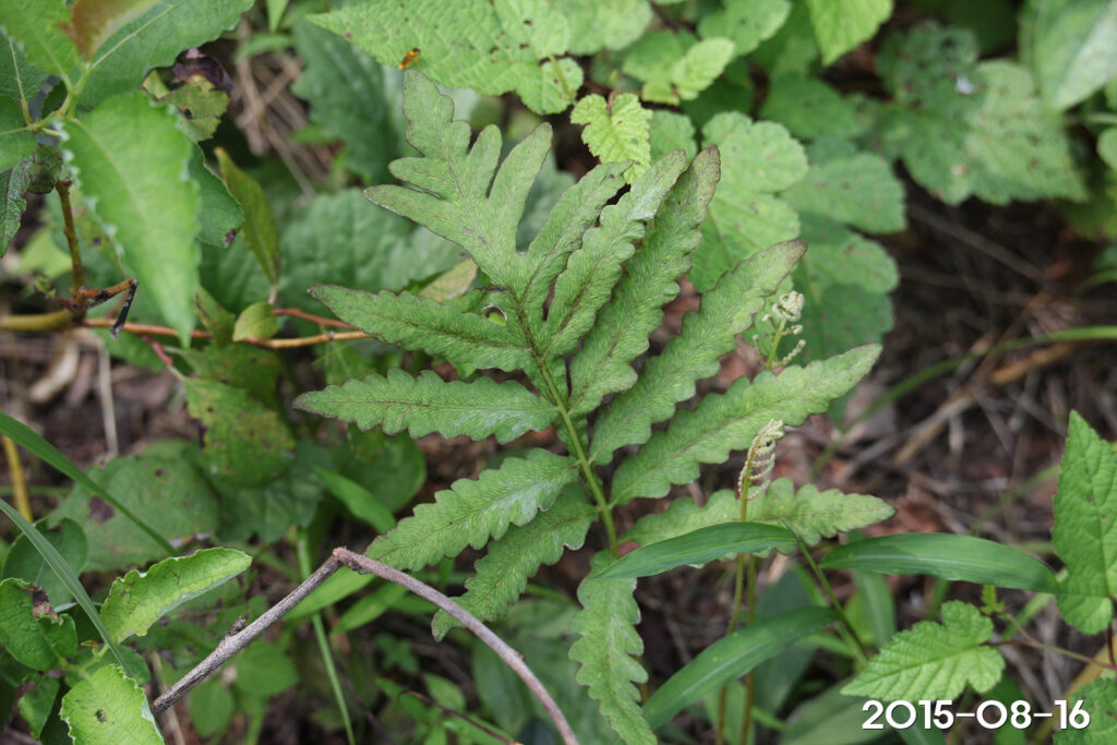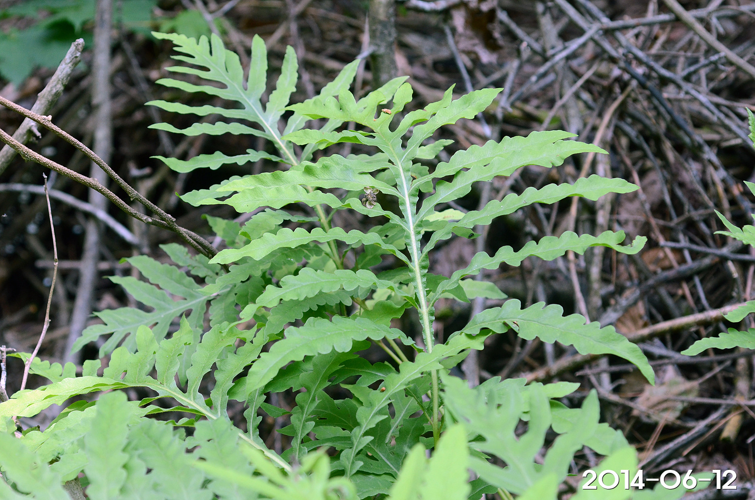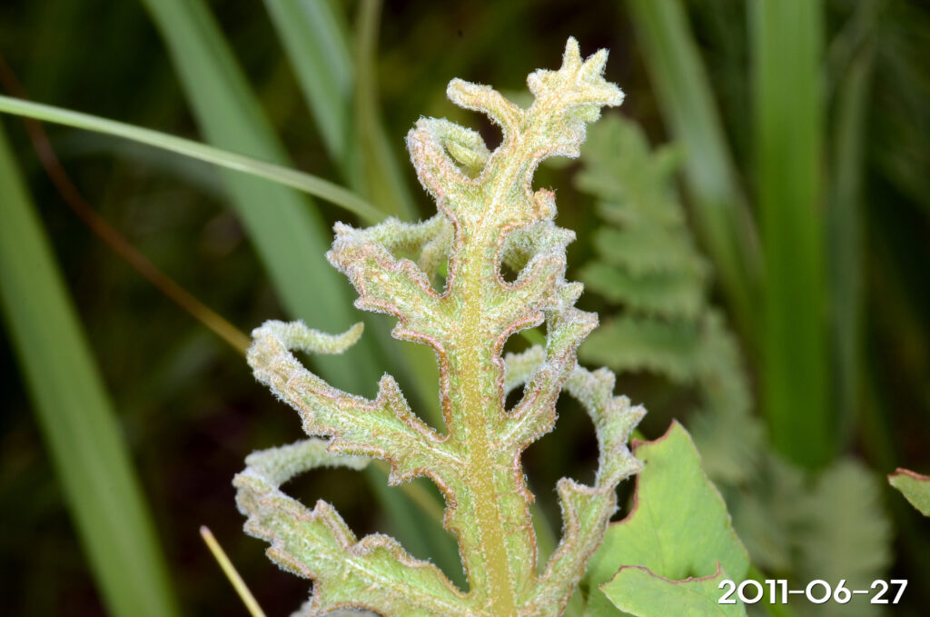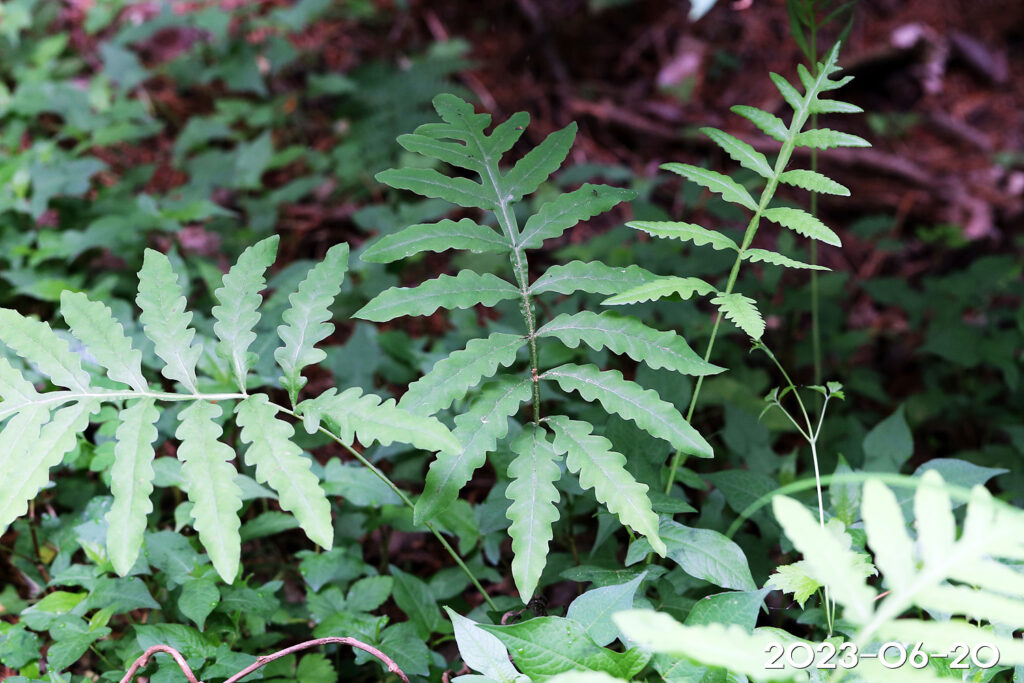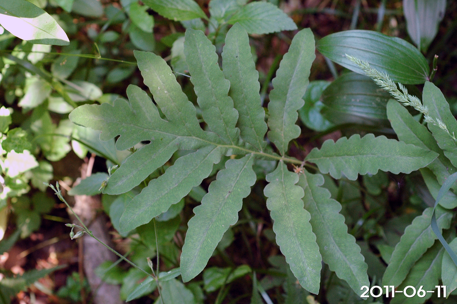 – 영양잎: 잎자루는 길이 10~50cm, 비늘조각은 난형, 길이 2~4mm, 연한 갈색. 잎몸은 삼각상 타원형, 길이 10~30cm, 폭 8~20cm, 우편은 5~11쌍. 우편은 장타원형 또는 피침형, 가장자리에 물결 모양 톱니가 있으며, 위쪽의 우편은 밑이 중축으로 흘러 날개를 이룸