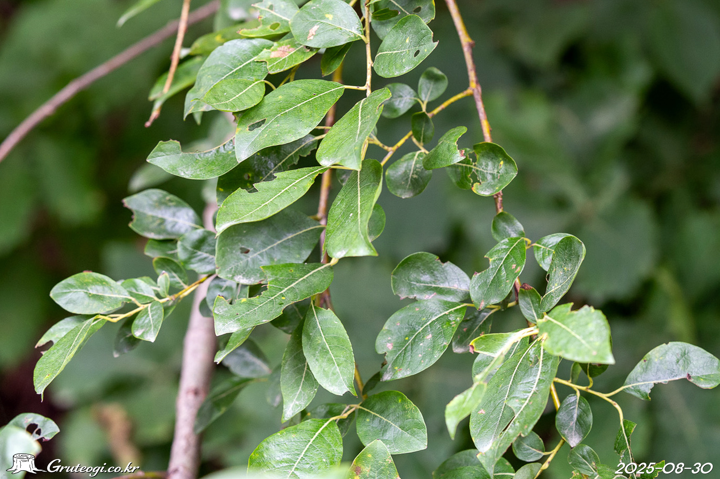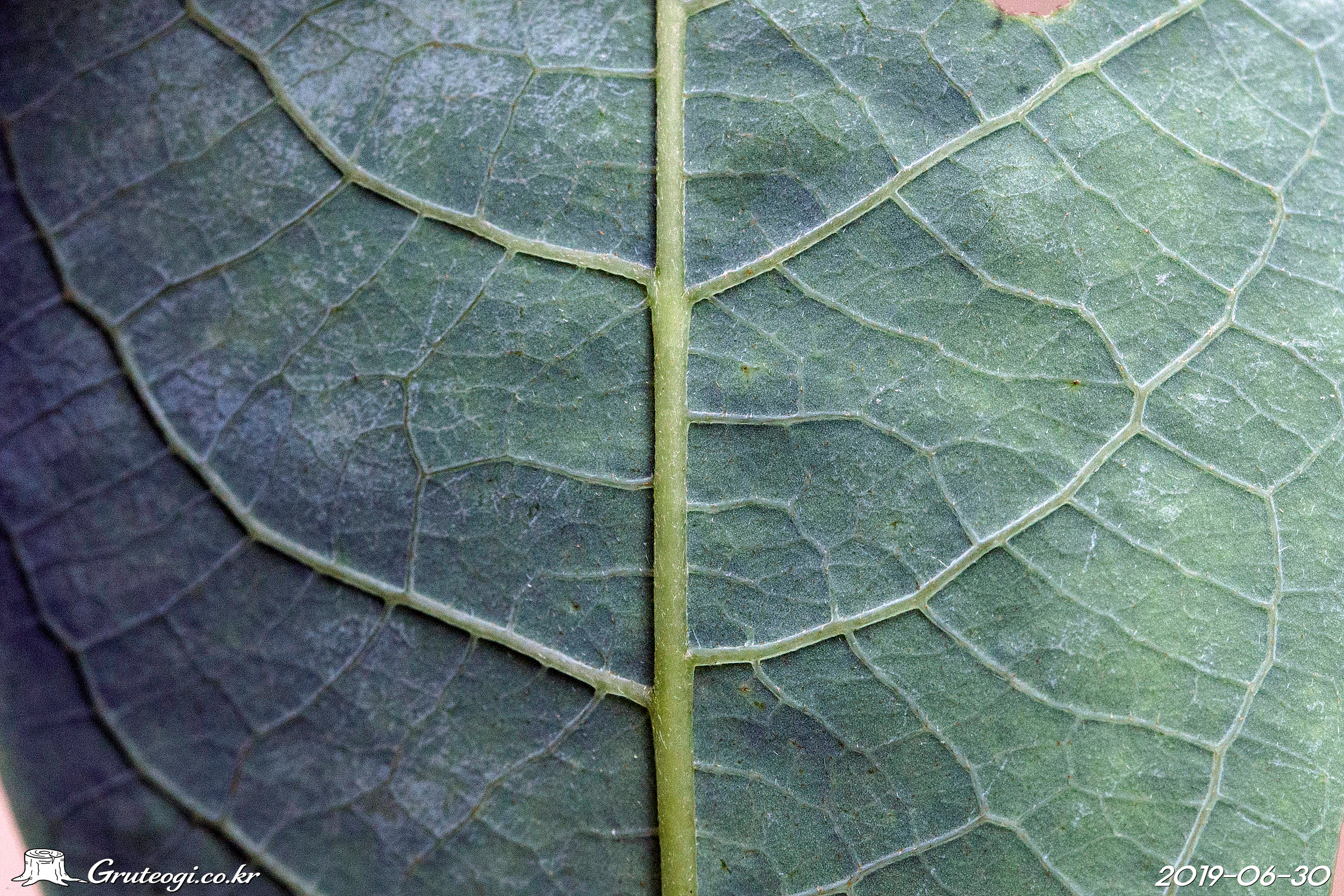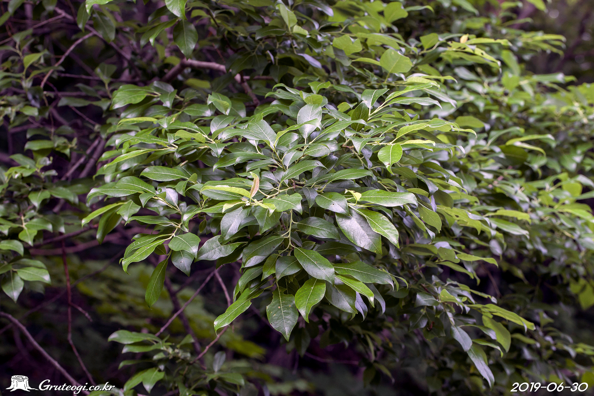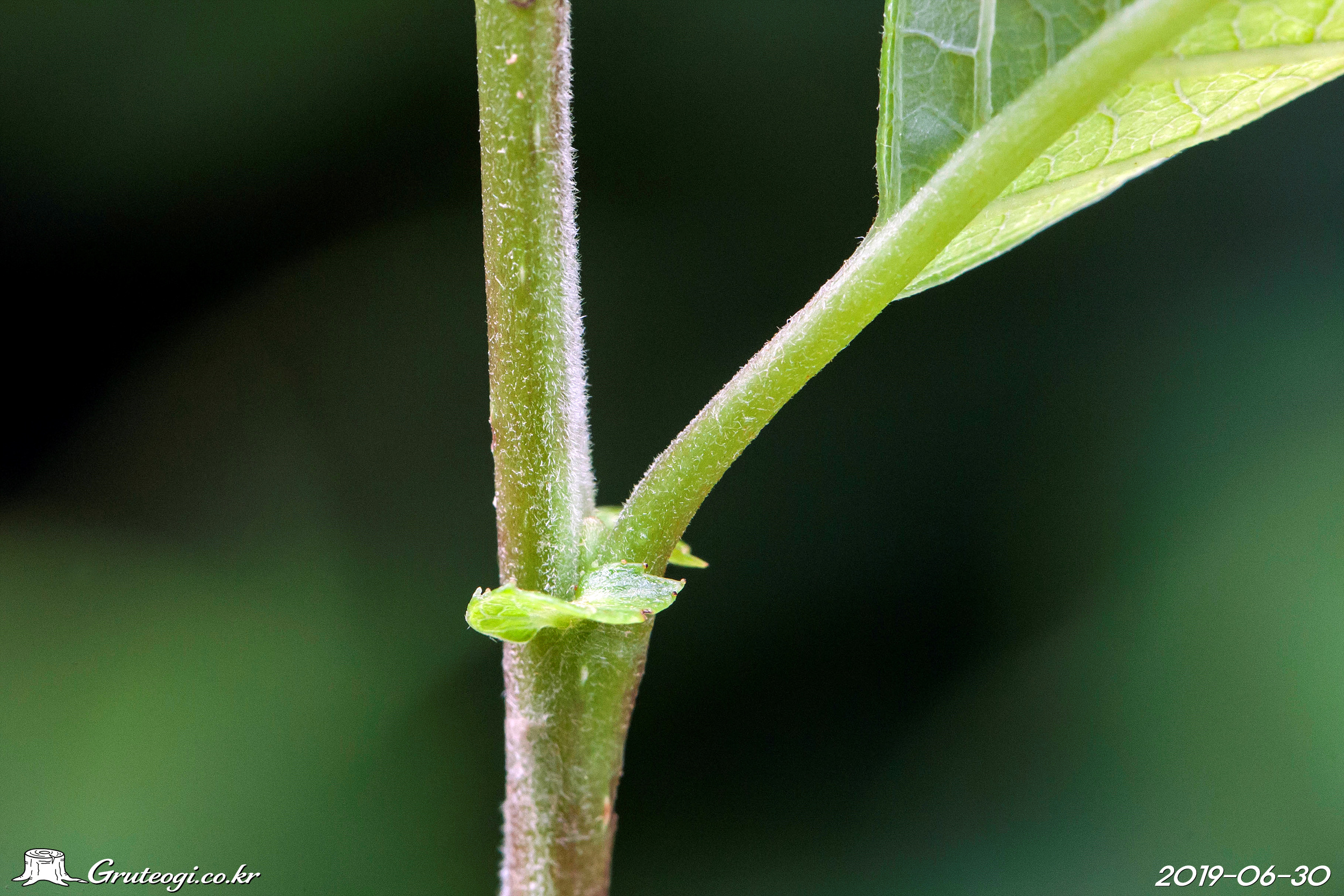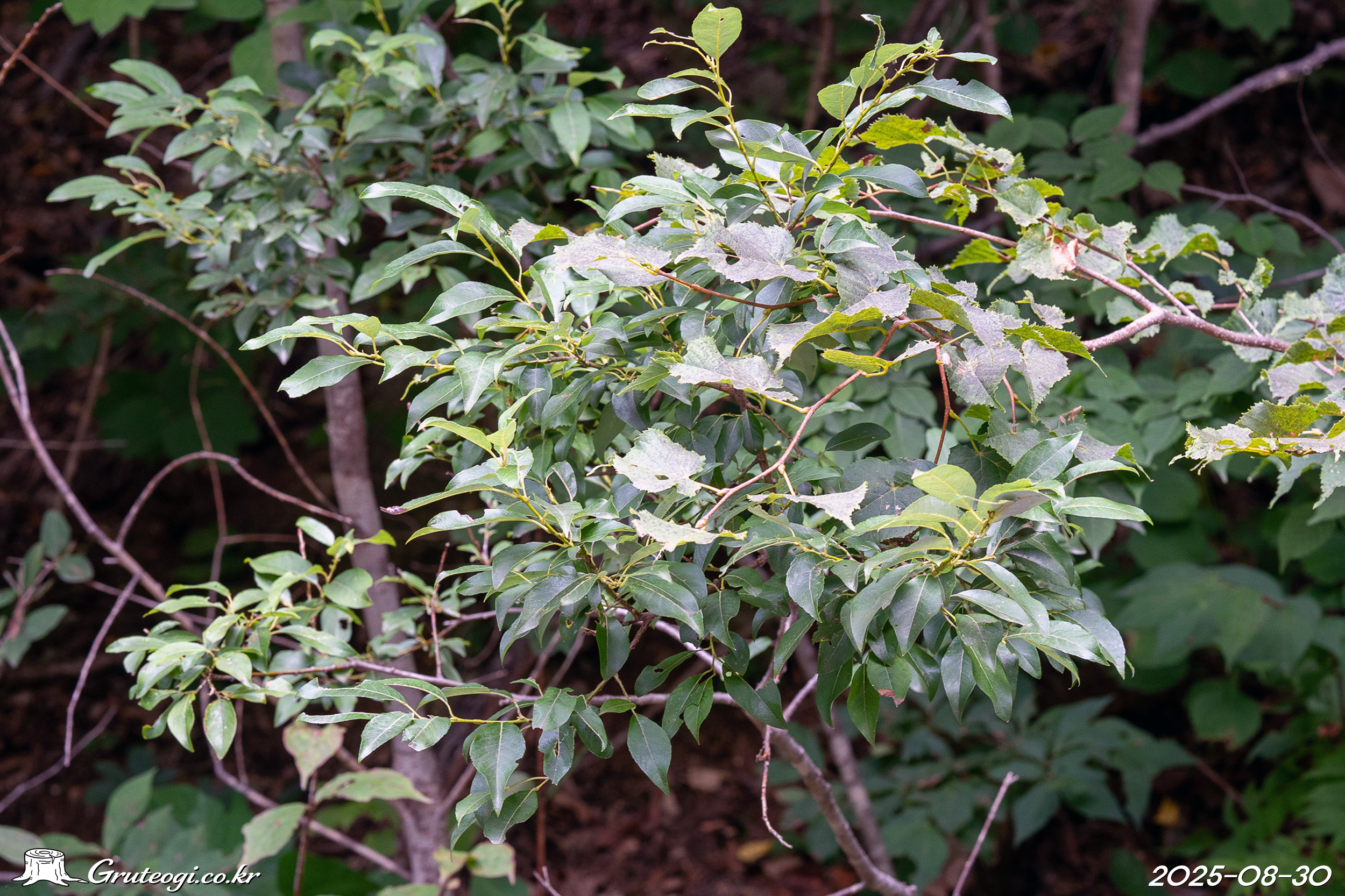– 잎: 긴 타원형 혹은 타원형, 끝은 뾰족하거나 짧게 점차 뾰족, 가장자리는 톱니가 있거나 밋밋하고, 뒷면은 흰색, 햇가지와 잎에 털이 있음