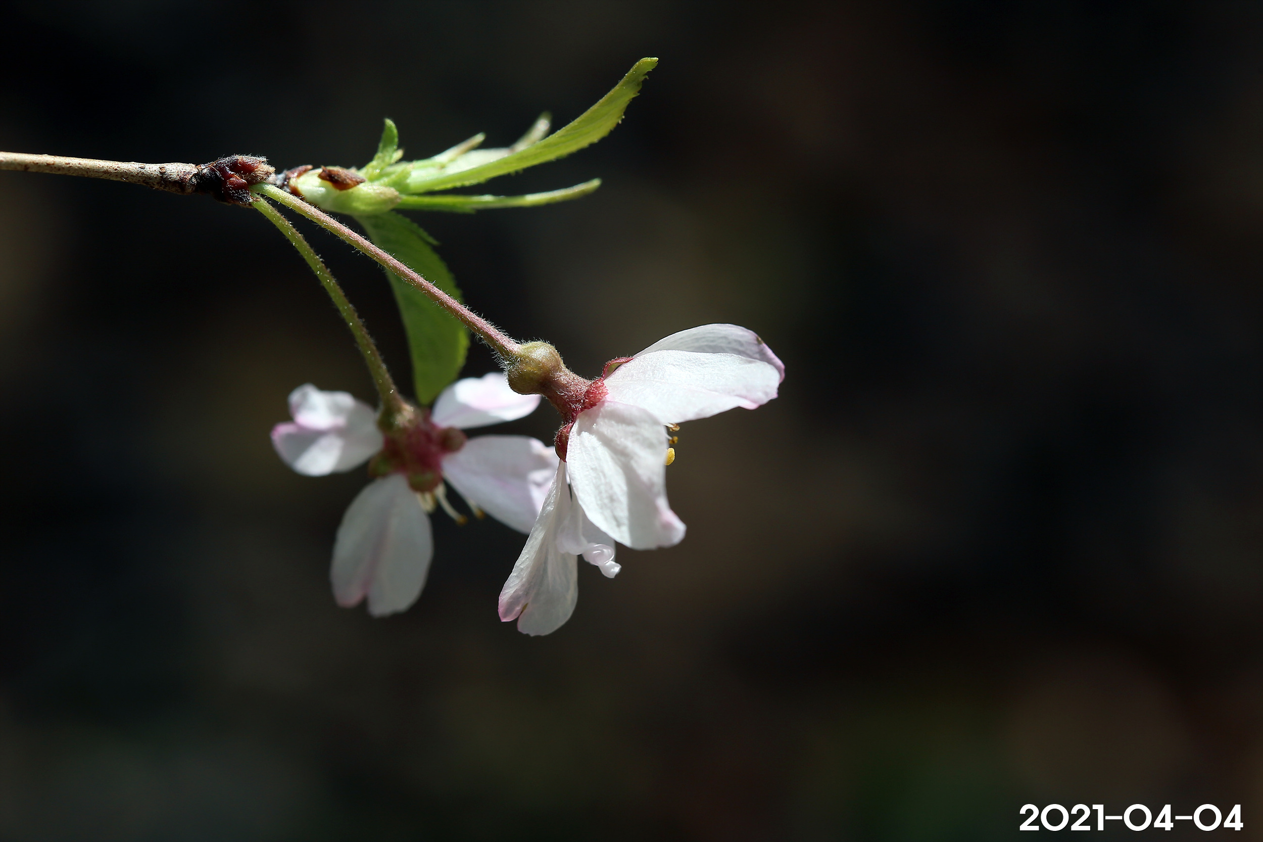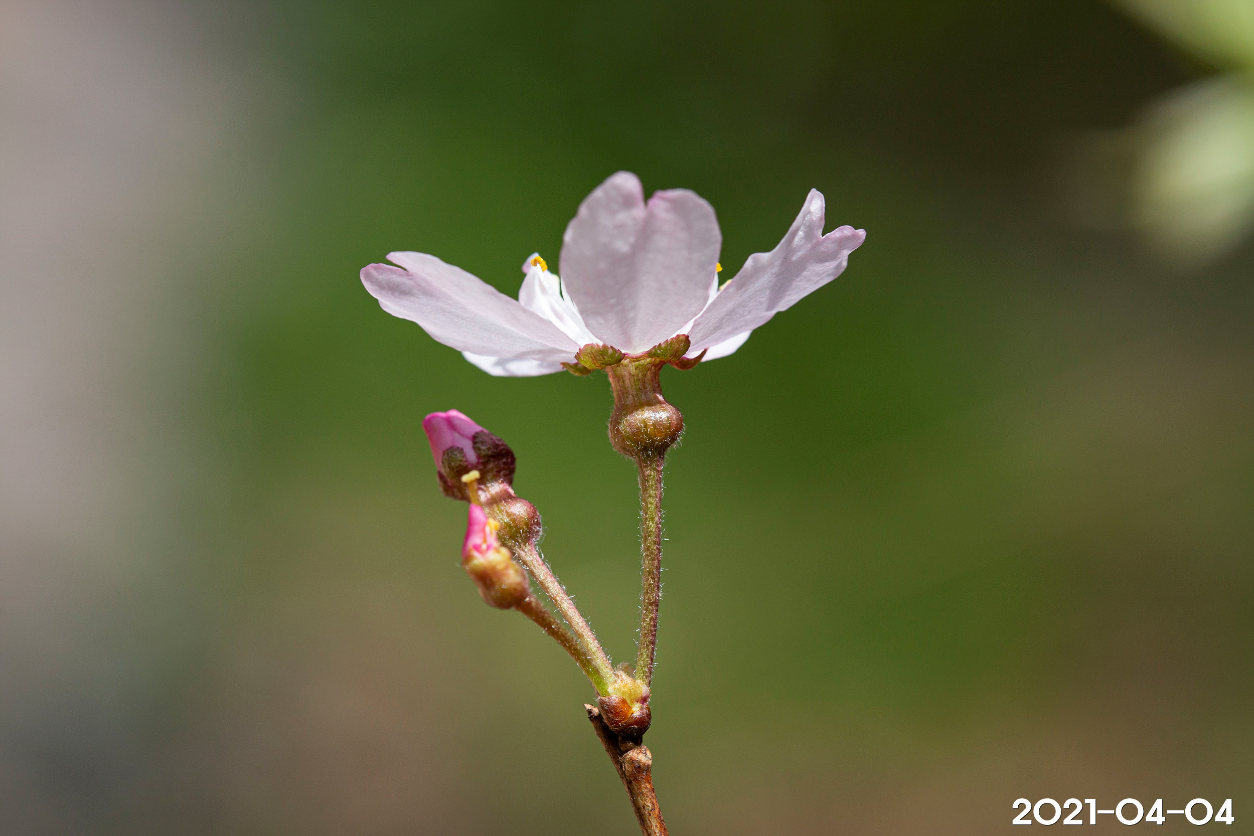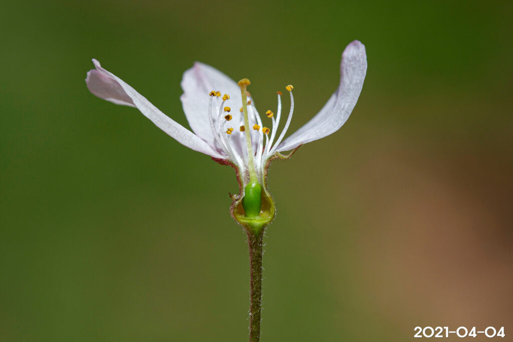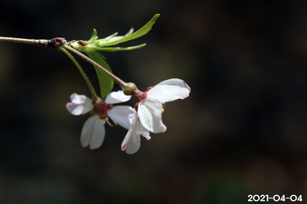– 꽃: 3~4월, 지름 1.5~1.8cm, 연한 홍색, 산형꽃차례에 2~5개의 꽃이 달림. 작은꽃자루는 길이 8~10mm, 털이 있음. 꽃받침통은 밑부분이 넓고 길이 5mm, 털이 있음. 꽃잎은 타원상 도란형, 길이 10mm