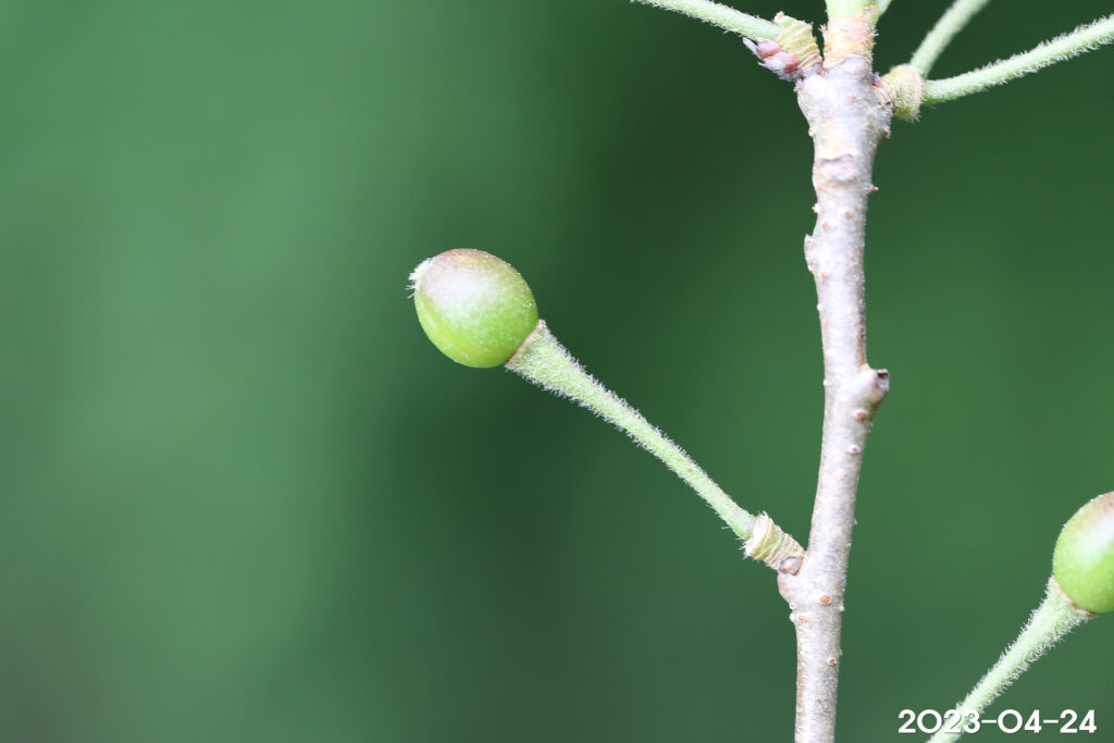 – 열매: 둥근 핵과, 지름 1cm 정도, 5~6월에 흑자색으로 익음