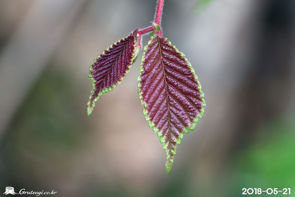 – 잎: 어긋나기, 넓은 타원상 도란형, 잎밑은 뾰족하거나 심장 모양, 길이 3~15cm, 너비 2~9cm, 겹톱니가 있음