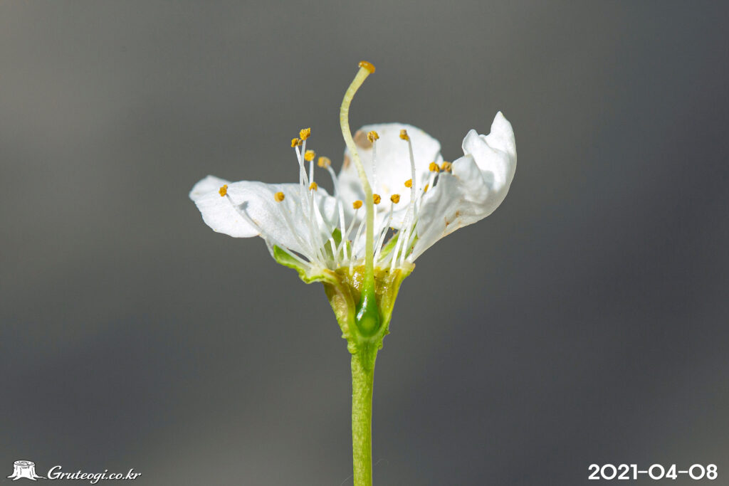 – 꽃: 4월, 잎보다 먼저 개화, 보통 3개씩 달림. 지름 2.0~2.2cm, 흰색. 꽃자루는 길이 17~18mm. 꽃받침조각은 5개, 타원형, 불규칙한 톱니가 있음. 꽃잎 5장, 넓은 난형, 길이 1cm쯤