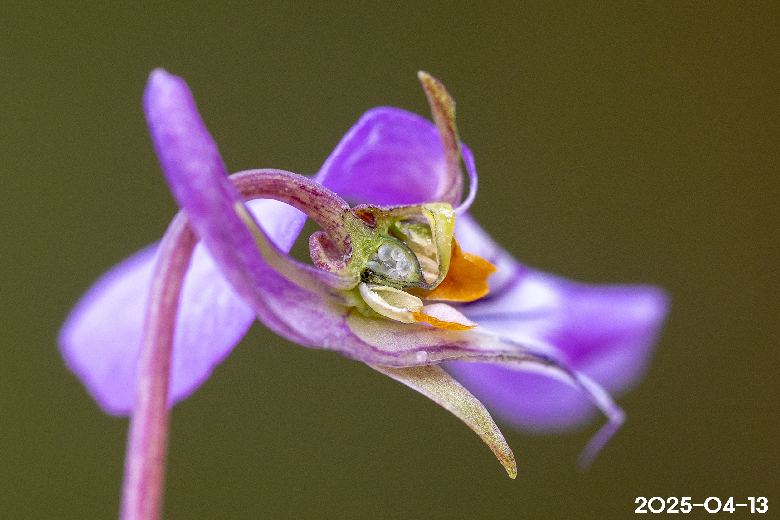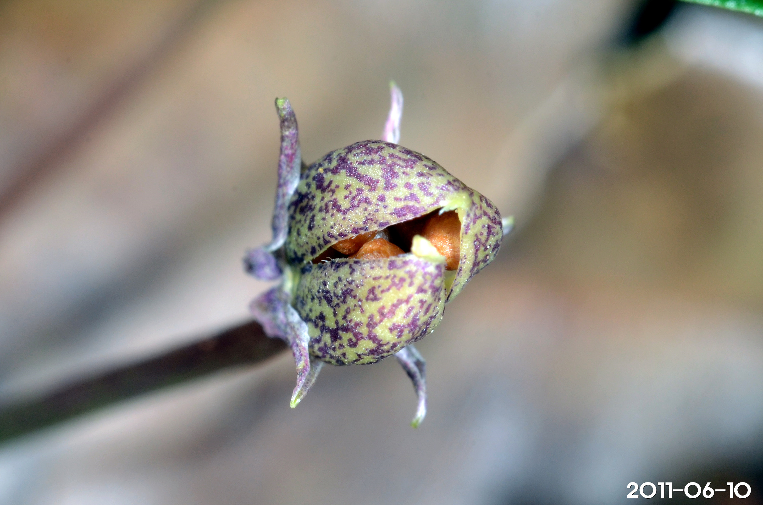- 꽃받침 : 넓은 피침형. 끝 예두. 뒤쪽 안 갈라짐. 옆꽃잎에 털 없음. 옆꽃잎과 아래 꽃잎 자색 줄