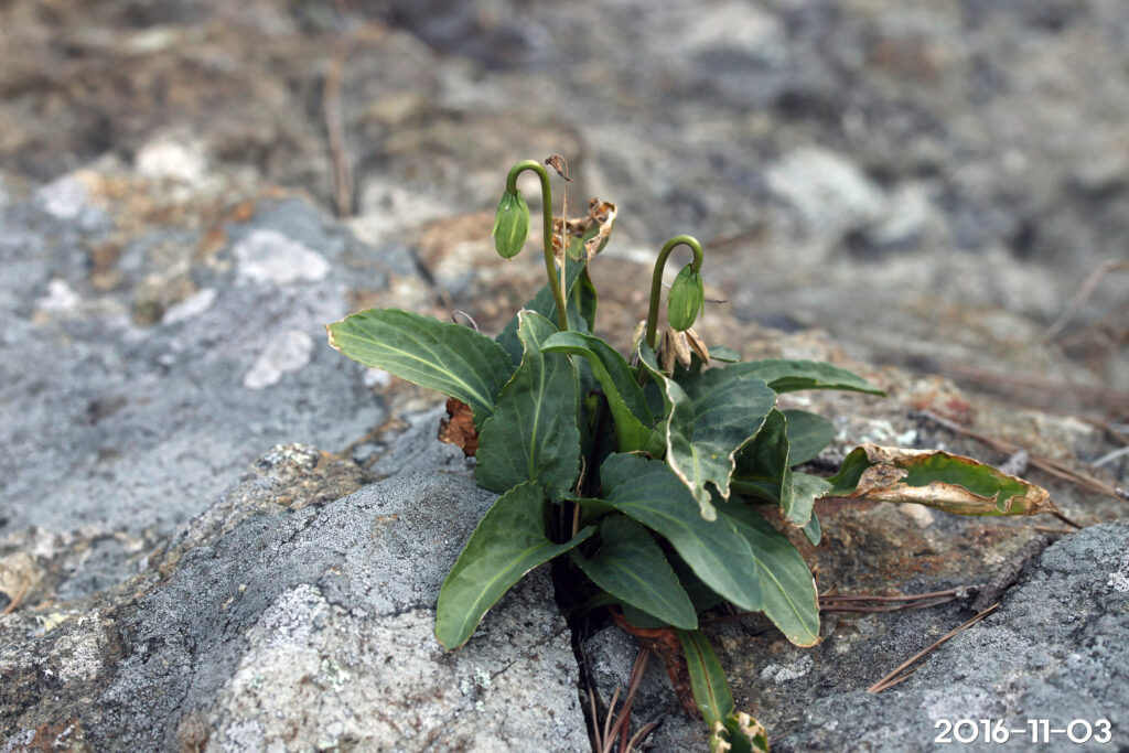 - 옆, 위 꽃잎에도 흐린 줄무늬. 꽃뿔 원통형, 씨방 털 없음