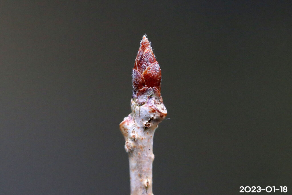 – 잎: 어긋나기, 길이 5~12cm, 폭 3~6cm. 잎 뒷면은 연한 녹색, 맥 위에 털이 있음