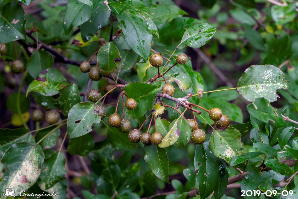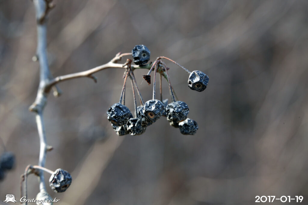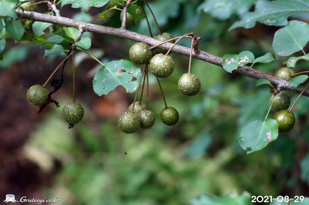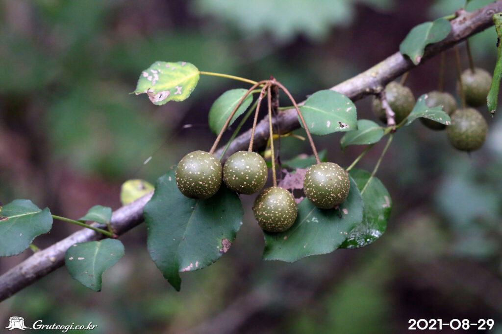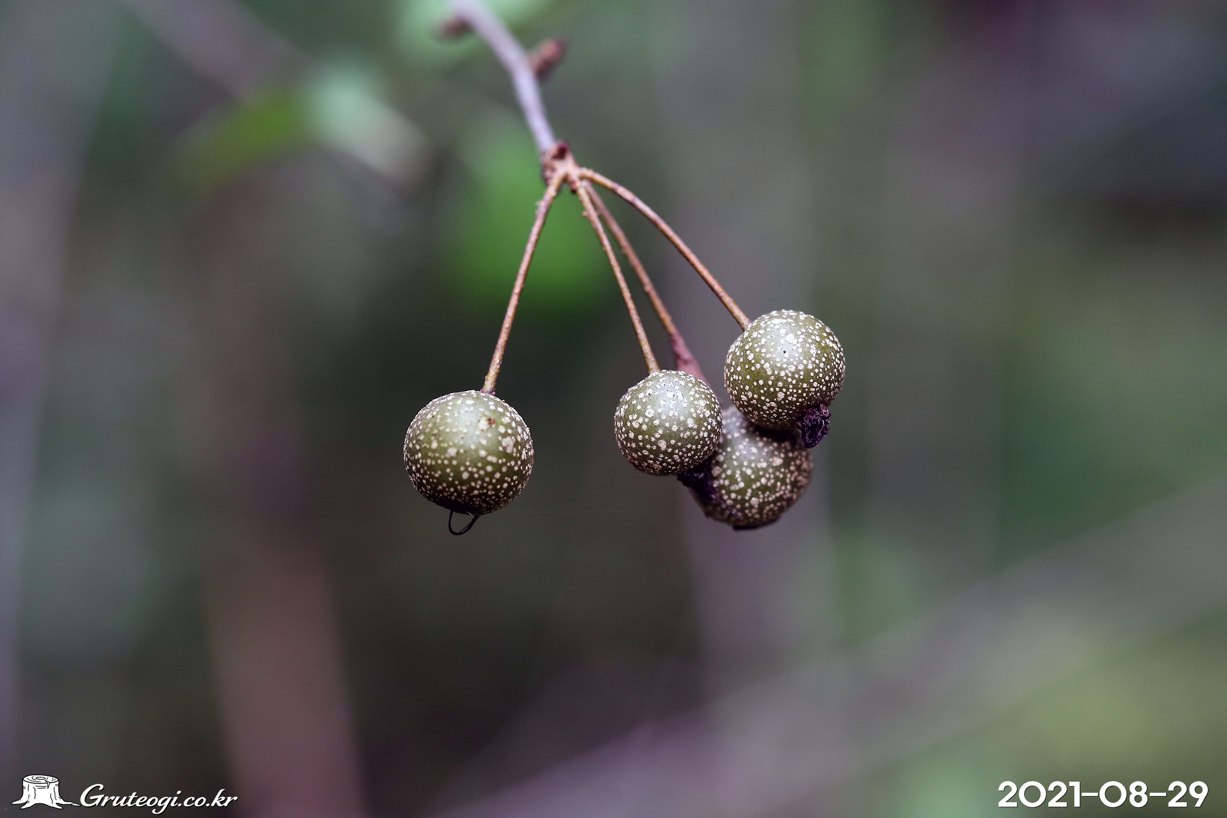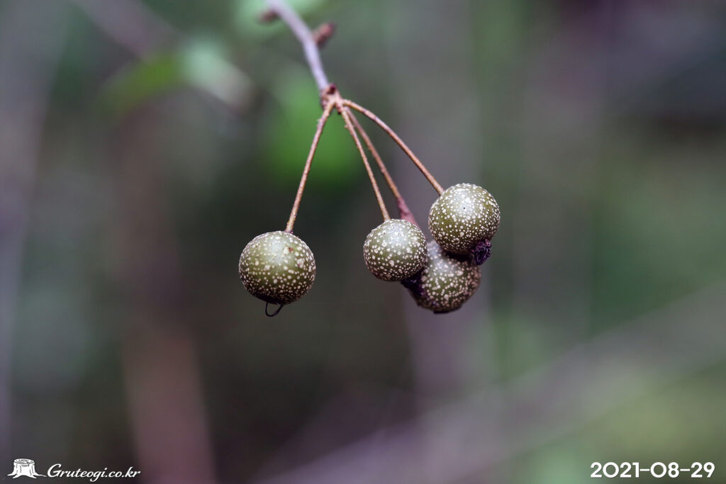 – 열매: 둥글고 지름 1.0~1.5cm, 10월에 녹갈색에서 흑색으로 익음