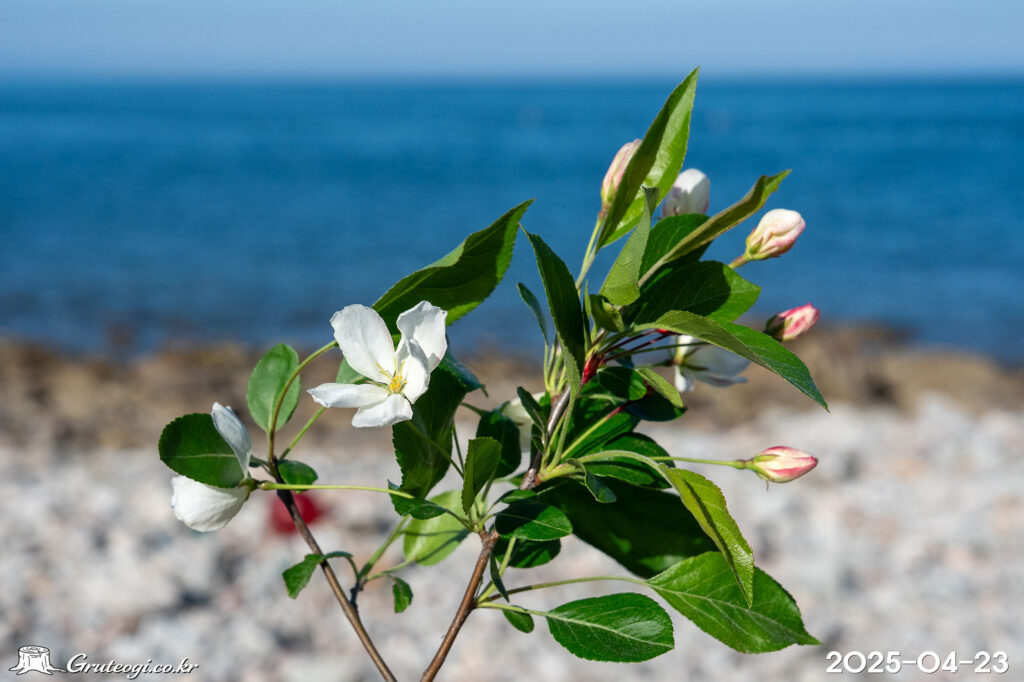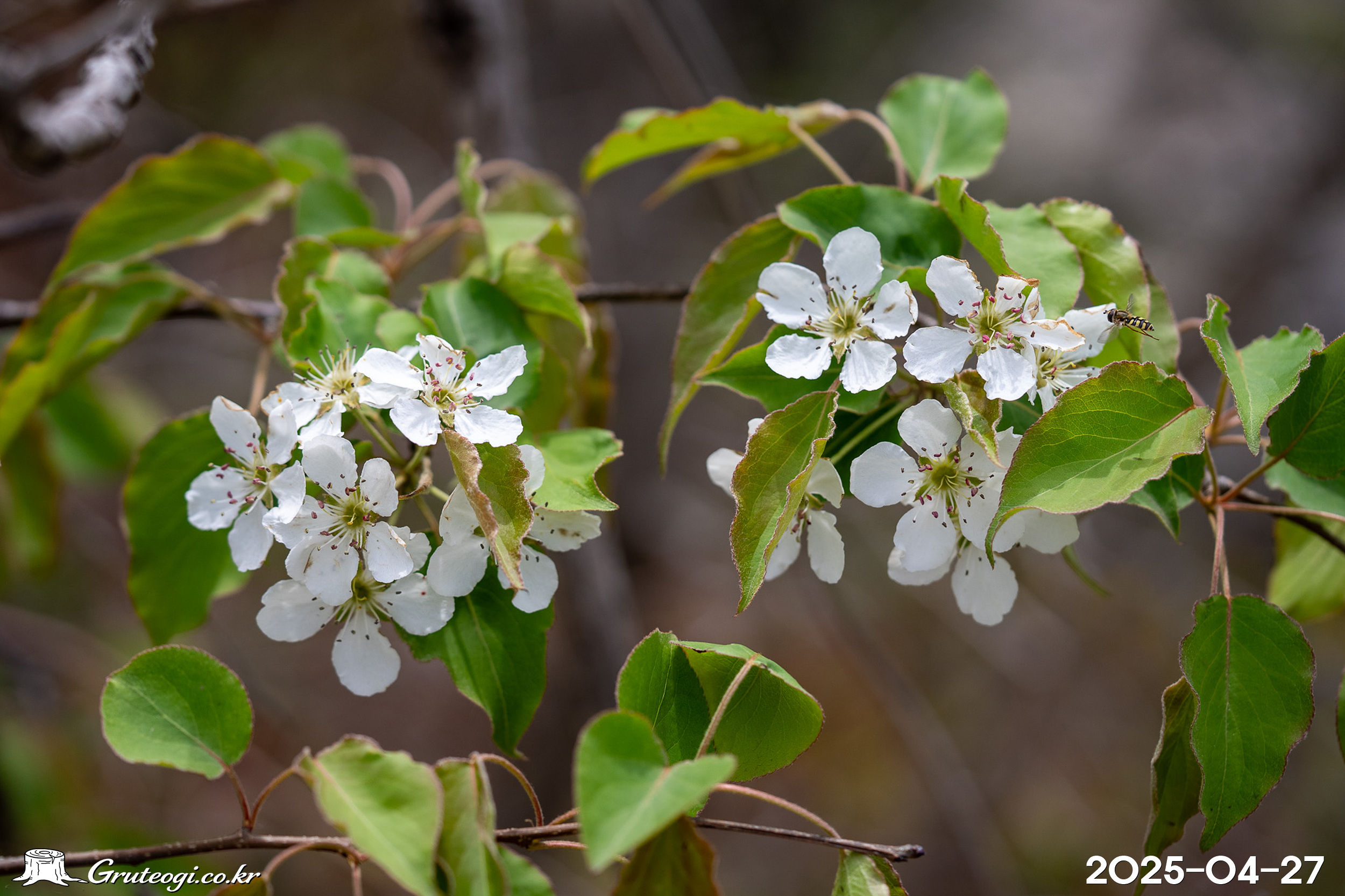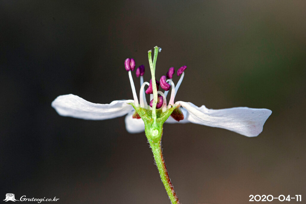 – 꽃: 4~5월, 짧은 가지 끝에 5~9개가 모여 달림, 지름 1.7~2.2cm, 흰색 또는 연한 홍색. 작은꽃자루는 길이 1.5cm 정도, 잔털이 있음. 꽃받침잎은 난형, 톱니가 없고 양면에 흰 털이 많음. 꽃잎은 원형, 도란형 또는 넓은 난형, 길이 1cm 정도. 꽃밥은 자줏빛이 도는 붉은색. 암술대는 2~3개, 털이 없음