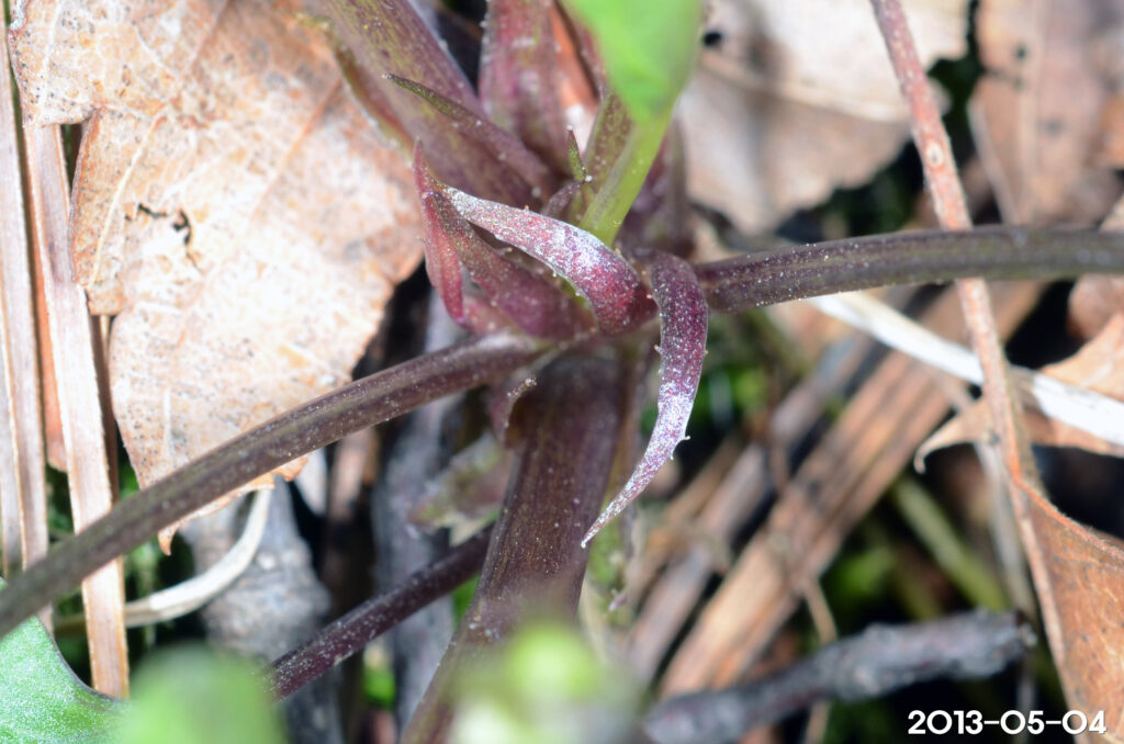 땅 위로 솟아나는 줄기가 있으며, 꽃은 하얀색이나 입술꽃잎에 자주색 줄이 있고, 심장 모양으로 생긴 잎이 작고, 턱잎이 밋밋하거나 얕은 톱니를 지니고 있어 구분된다.
