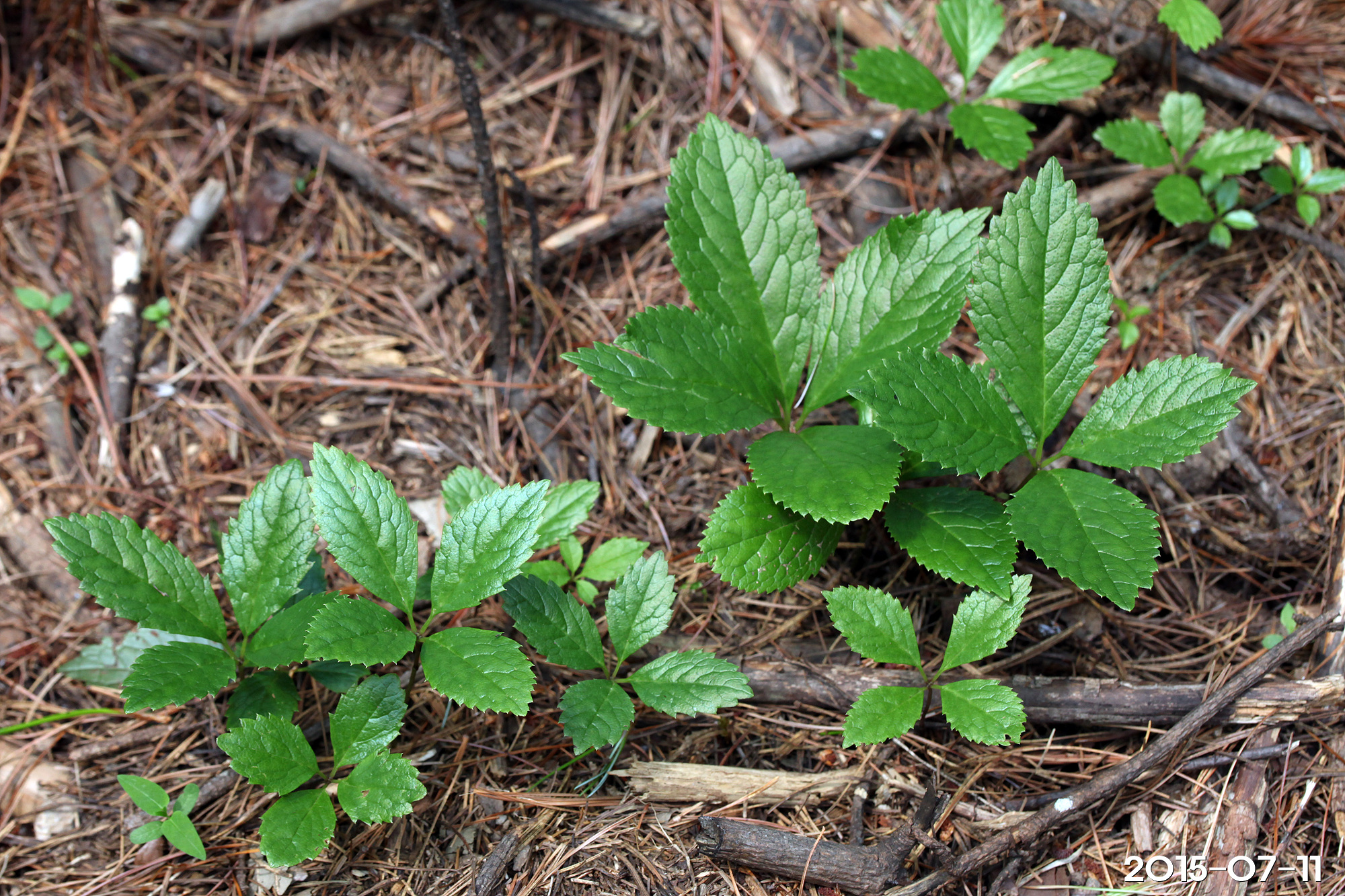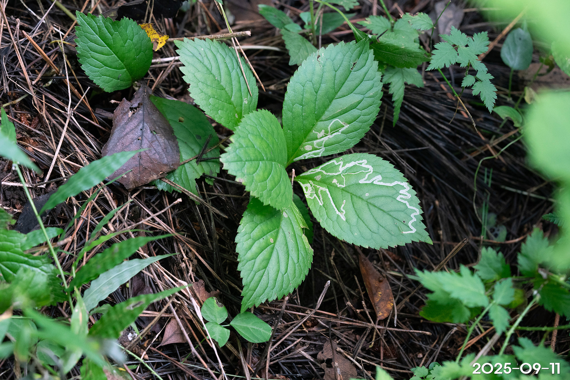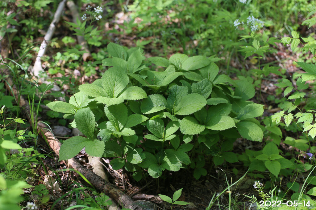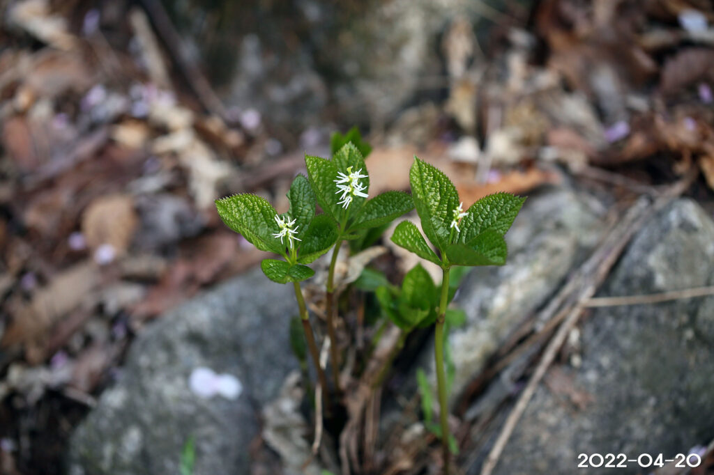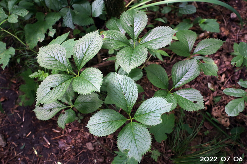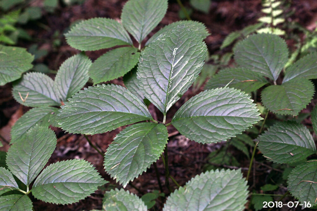 – 잎: 줄기 끝에 4장이 모여나며, 난형 또는 타원형, 길이 4~12cm, 폭 5~6cm, 가장자리에 날카로운 톱니가 있음